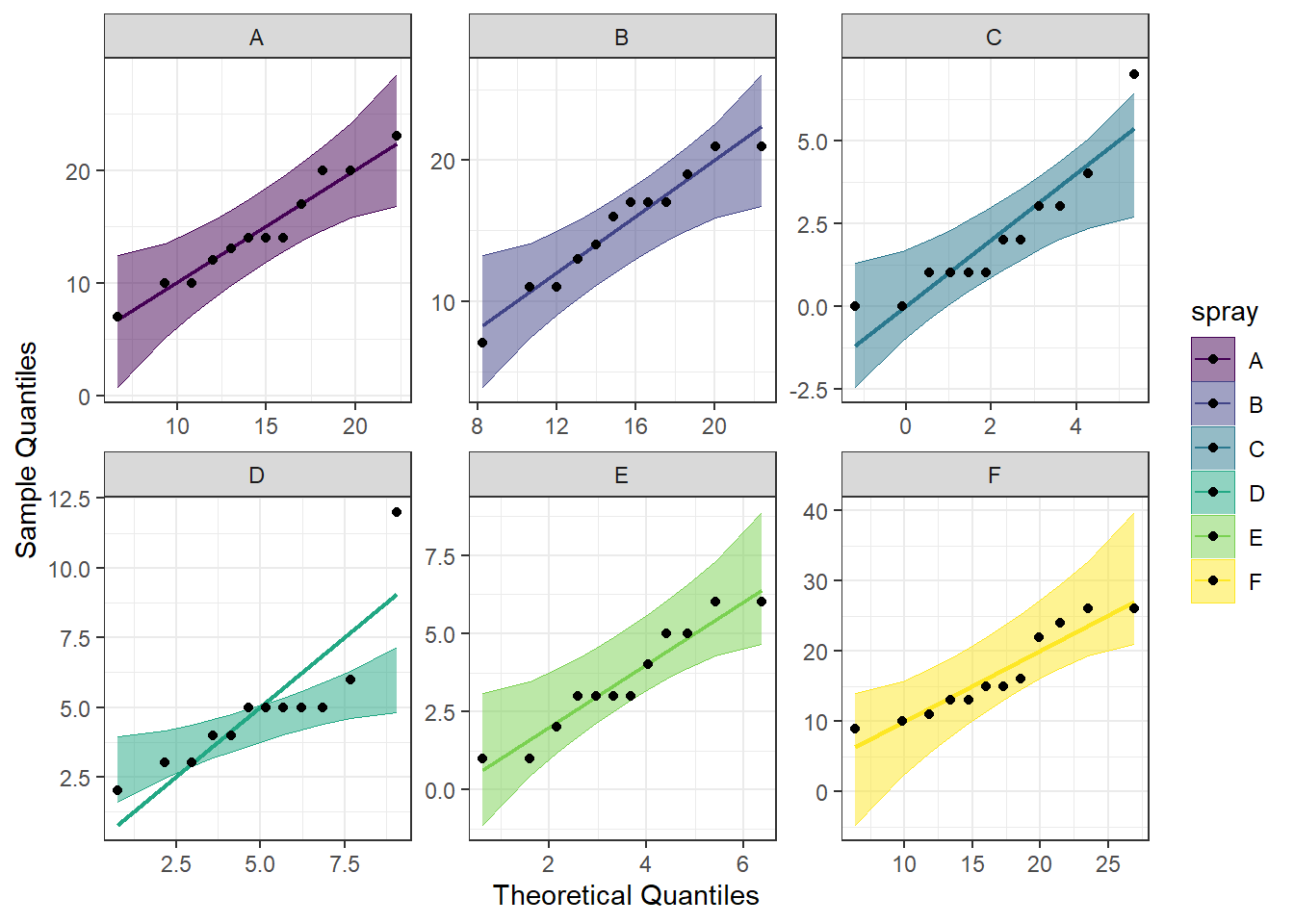 5. facet_wrap(~ spray, scales = "free") + is a similar argument to the bar plot above. This is sorting by group (~ spray), and creating a qq plot for each of our sprays. The scales = "free" refers to the scales of the axes; by setting them to “free” we are allowing them to freely vary between each of the graphs. If you want the scale to be fixed, you would use scale = "fixed".
