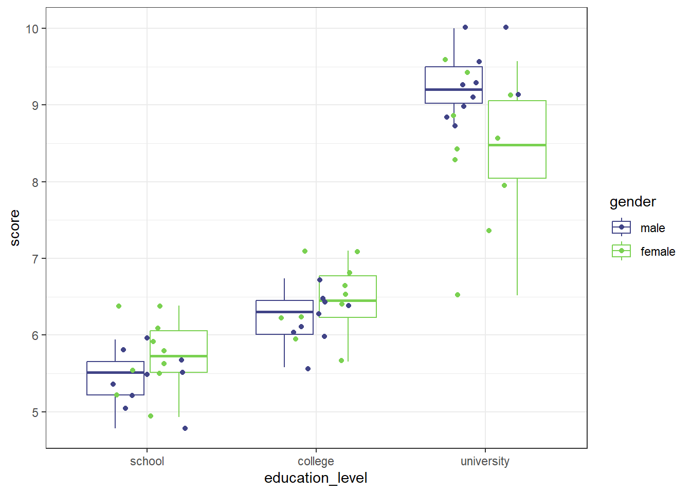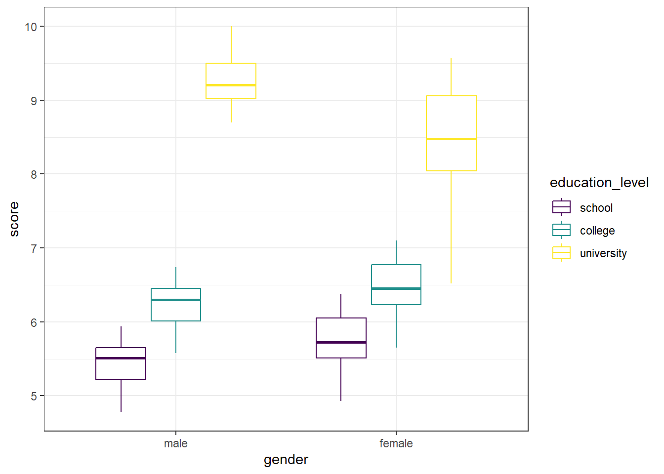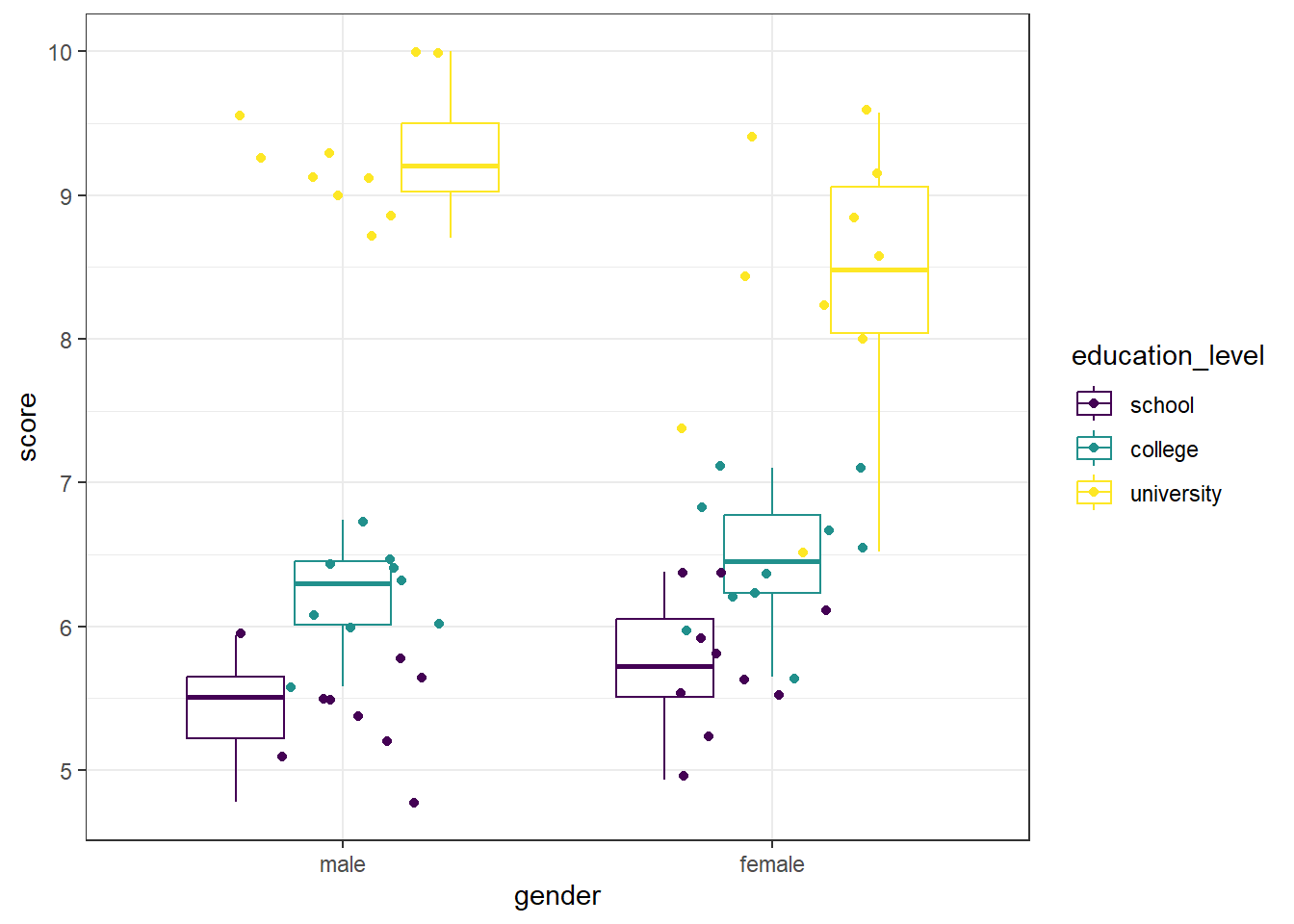A boxplot can be used to visually identify if there are outliers in any of the combinations. We will make a boxplot using ggplot2 and using viridis for our color scale. In the code below, we first define our data (data = job) and x (x = gender) and y (y = score) values. Our x value is our grouping variable (time) that we want on the x-axis, and our y value is the one we are comparing (scores). The next line calls the boxplot function (geom_boxplot()). We added the argument aes(color = education_level) to allow different colors per treatment group. geom_jitter() prints each data point as a dot on the box plot, and the argument aes(color = education_level) again color-codes the dots by treatment. The next line, scale_color_viridis(discrete = TRUE) assigns the viridis color scale to the colors in the plot, which is a colorblind friendly scale. discrete = TRUE is used because we are not using all continuous variables. The last line is a theme line, and addresses details such as plot background color.
