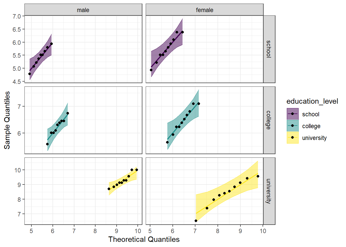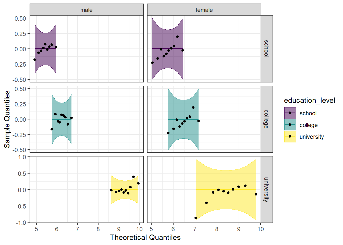 We can see that there are no extreme outliers, as long as we are careful to color-match. This can get visually challenging, and we can take one of two approachs. The first is to re-assign our x-axis to reflect the IV with more levels (so, education level rather than gender). This makes it easier to match up the data points, if you have IVs with few factor levels. As a personal preference, I added begin = 0.2, end = 0.8 to the scale_color_viridis() function to avoid dark purple and yellow being the only two colors to be used. This can easily be left off.