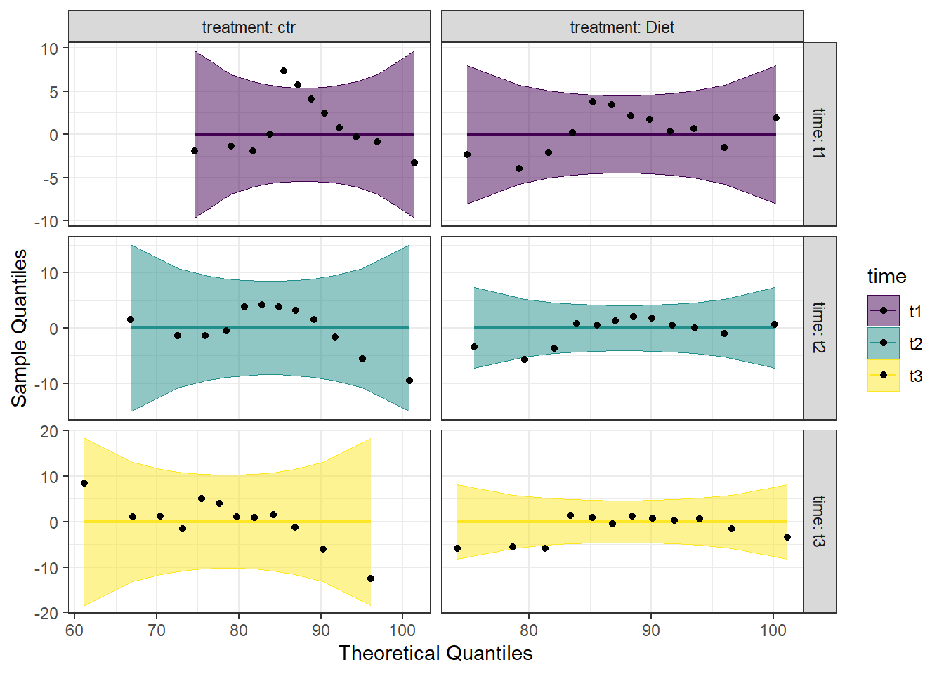 Now, we test the assumptions. Similar to the one-way within subjects anova, we will test on each time point as the grouping variable, but we are adding in treatment as a second grouping variable. The normality checks will all look familiar, and we will be adding the check of sphericity assumption. In order to get R to split by group, we will make use of the ‘pipe’(%>%) from the tidyverse package.