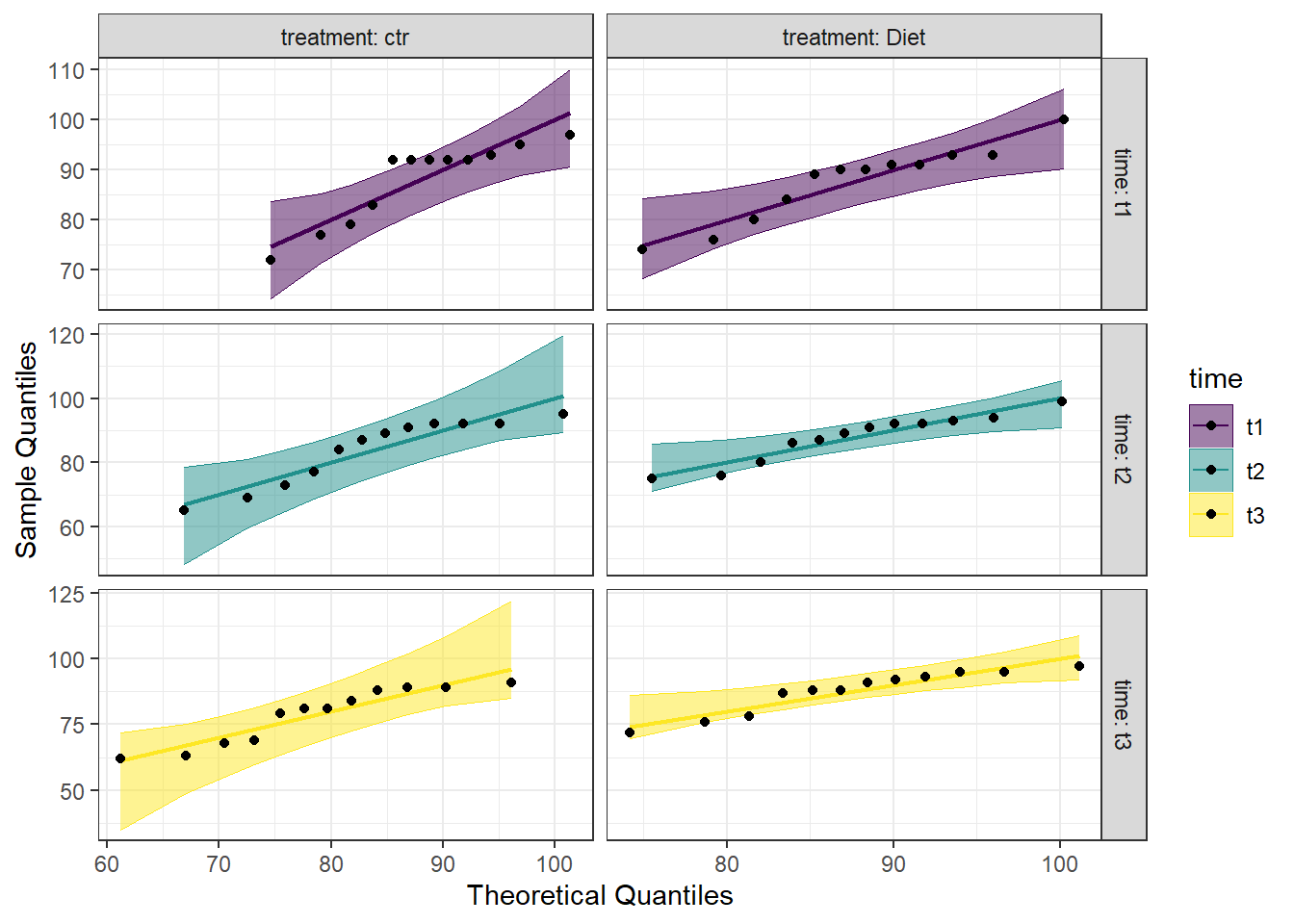 Packages used: datarium, tidyverse, psych, ggplot2, qqplotr, viridis, afex