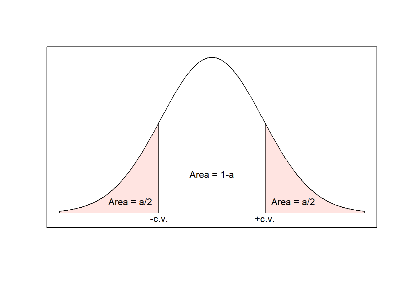 The 100(1-\(\alpha\))% confidence interval for \(\mu\) is given by \[\bar{x}\pm z_{\alpha/2}\frac{\sigma}{\sqrt{n}}\] where \(z_{\alpha/2}\) is the z-score associated with the \([1-(\alpha/2)]\)th percentile of the standard normal distribution. The value \(z_{\alpha/2}\) is called the critical value (“c.v.” on the plot, below).