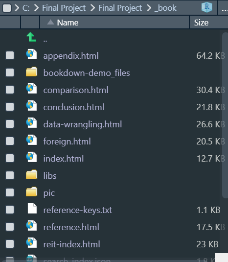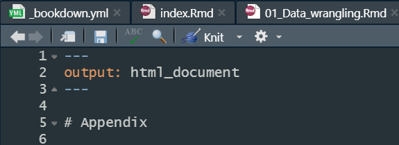 步驟二、所有Rmd章節(不含index.Rmd)前加output: html_document,如此knit才會在_book資料夾中生成該章節的html檔,確認所有章節(含index)均於_book資料夾生成html檔。
