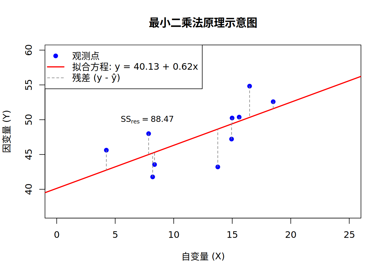 咱们的九年义务教育还没忘的读者应该都能理解这样一个方程如何在直角坐标系中画出来。问题在于,我们如何确定b0 和b1 这两个系数。不过故事可能是完全反过来的。我们确定这两个系数的方法叫做最小二乘法,这个办法其实也简单地在笔者本人的高中数学里讲过。这个办法也叫最小平方法,也就是找到一个函数,让误差最小。误差是什么呢,就是函数对数据的预测与实际数据之间的差值。请看下图: