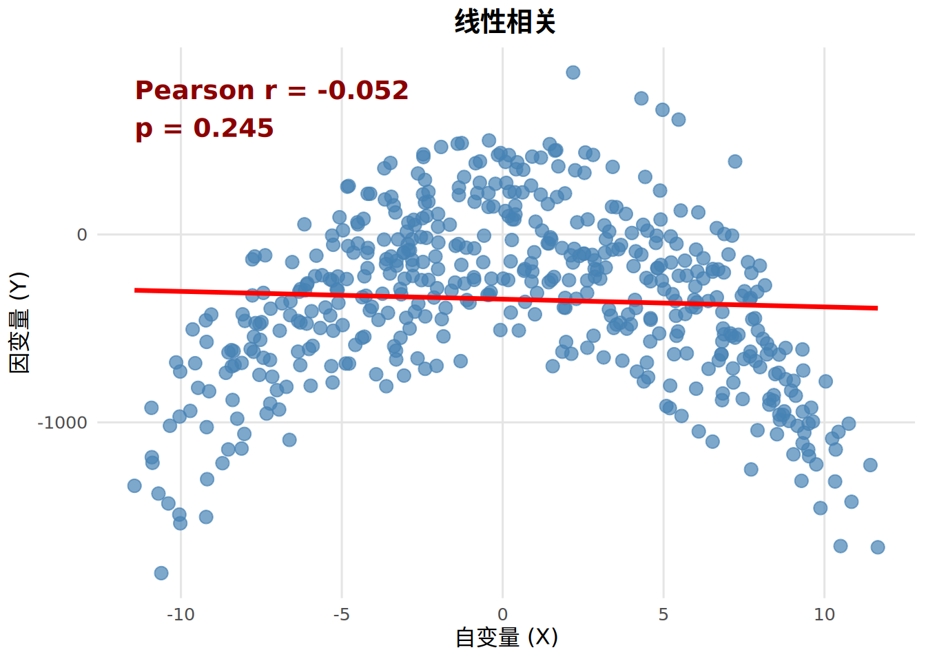 事实上,两变量的皮尔逊相关系数描述的就是两个变量的线性关系。比如下图中就展示了两个变量的散点图,如果对数据计算皮尔逊相关系数并检验显著性,r = -.052, p = .245。换句话说,皮尔逊相关的结果说明两个变量之间没有相关。图中拟合出的直线也似乎没有很好的描述数据的趋势。