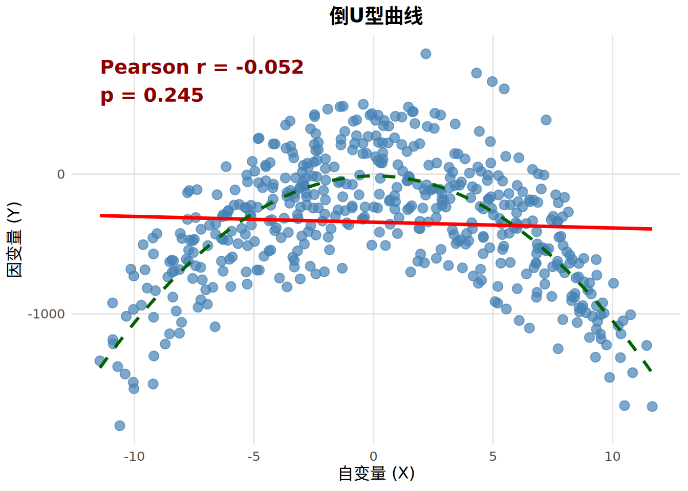 可以看到,图中的绿色虚线提示了两个变量间的关系其实是非线性的,实际上是一个倒U型曲线(想想心理学常说的关于动机和表现的耶基斯–多德森定律)。这条线一画,看上去就对数据的趋势有了一个贴切的描述。换句话说就是,皮尔逊相关系数并不能找到非线性,也就是不能用一条直线描述的相关关系(对非线性关系的检验我们会在 ?sec-nonlinear 中介绍)。所以,不管是点二项相关还是皮尔逊相关系数,反映的都是一种“线性”的相关关系。