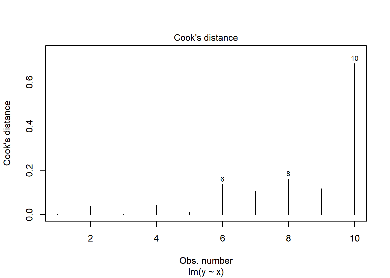 With the example using the simulated sample with 10 observations, the rule of thumb would be \(4/10\). Again, the 10th observation is above this threshold and would requires some consideration.