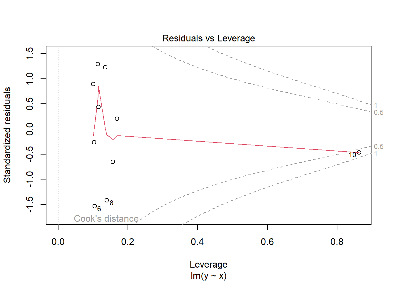 With the example using the simulated sample with 10 observations, the rule of thumb would be \(4/10\). Again, the 10th observation is above this threshold and would requires some consideration.