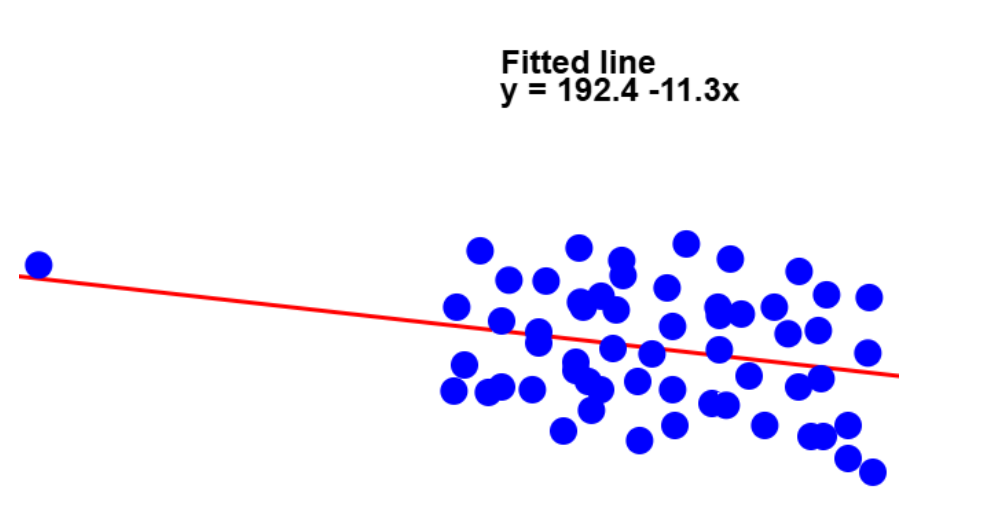 An outlier is a point with a large residual (i.e., points that are a long distance on the y-axis from the fitted line). Sometimes an outlier can have a large impact on the estimates of the regression parameter. If you move some of the points in the scatterplot below so that they become outliers (far from the other points on the y-axis / the regression line), you can see this will affect the estimated regression line. However, not all outliers are the same. Try moving up and down one of the points at the beginning or the end of the \(X\) scale. The impact in the regression line is much stronger than if you do the same with a point in the mid range of \(X\).