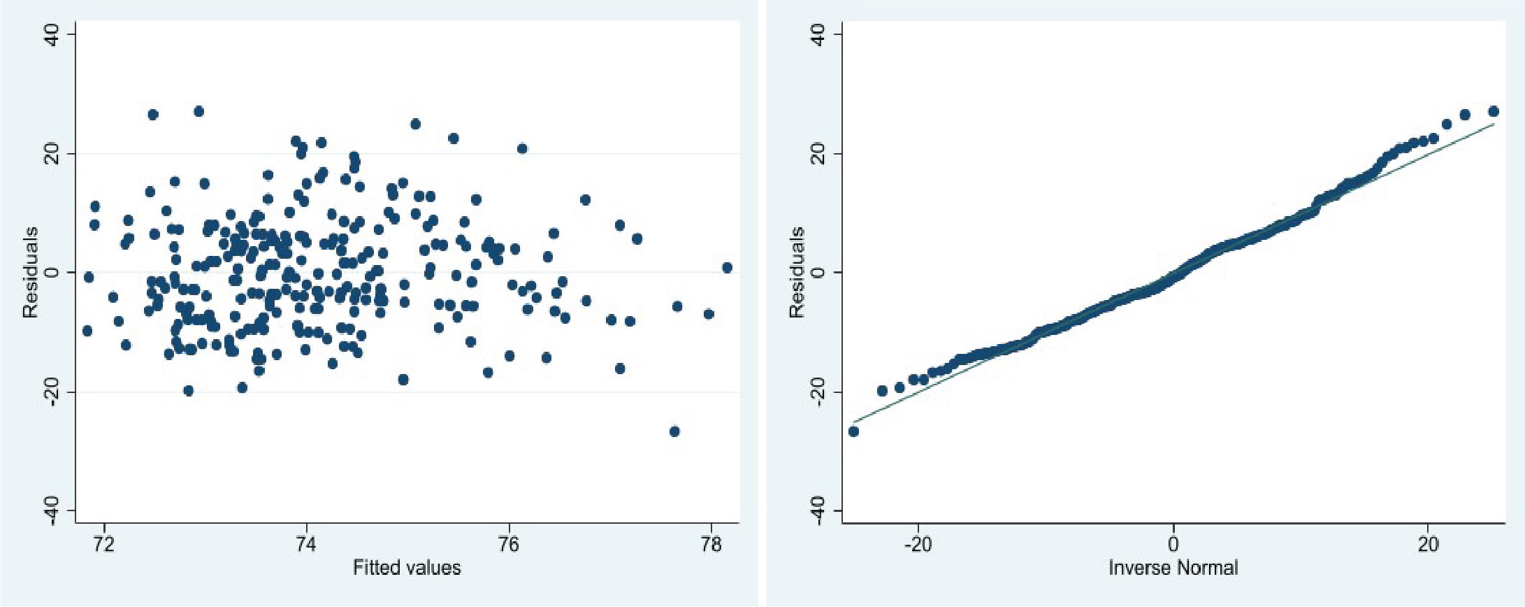use hers_subsetreg DBP BMIrvfplot/* the residual versus fitted plot */predict res_std, residuals /* calculate the residuals*/qnorm res_std /* The normal quantile plot of the residuals*/## Source | SS df MS Number ofobs = 276## -------------+---------------------------------- F(1, 274) = 4.84## Model | 423.883938 1 423.883938 Prob > F = 0.0286## Residual | 23988.8842 274 87.5506722 R-squared = 0.0174## -------------+---------------------------------- Adj R-squared = 0.0138## Total | 24412.7681 275 88.7737022 Root MSE = 9.3569## ## ------------------------------------------------------------------------------## DBP | Coefficient Std. err. t P>|t| [95% conf. interval]## -------------+----------------------------------------------------------------## BMI | .2221827 .1009756 2.20 0.029 .0233961 .4209693## _cons | 67.82592 2.923282 23.20 0.000 62.07097 73.58087## ------------------------------------------------------------------------------
