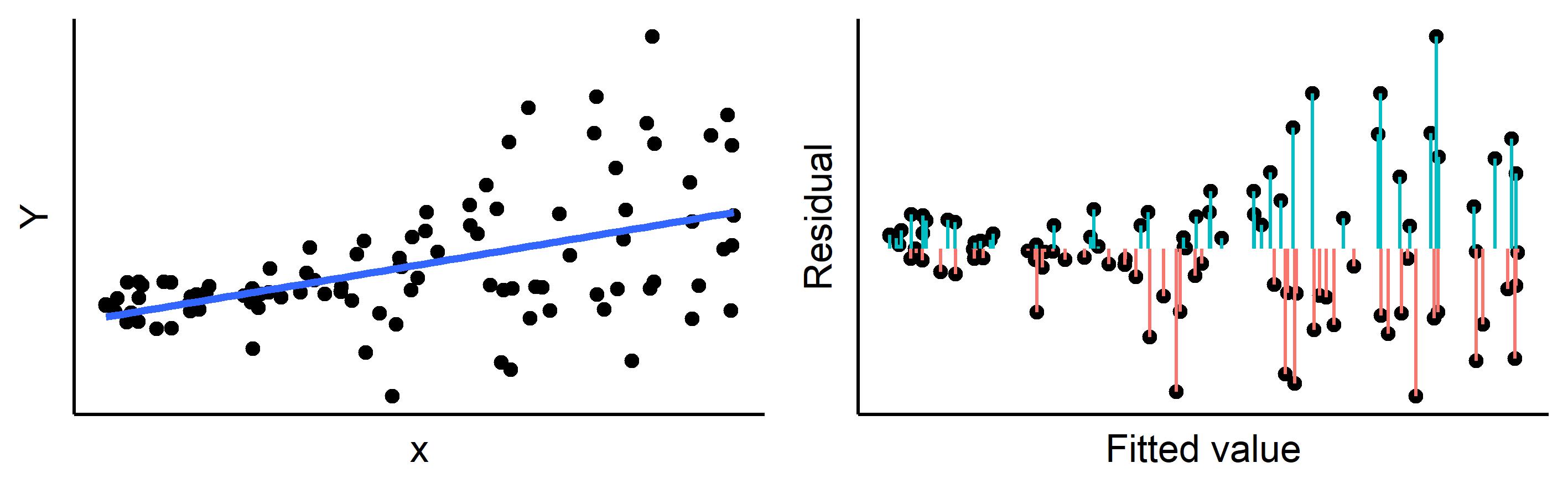 Here, we can see that as \(x\) increases, so does the variance of the residuals. This leads to a fanning out pattern in the residual vs fitted plot.