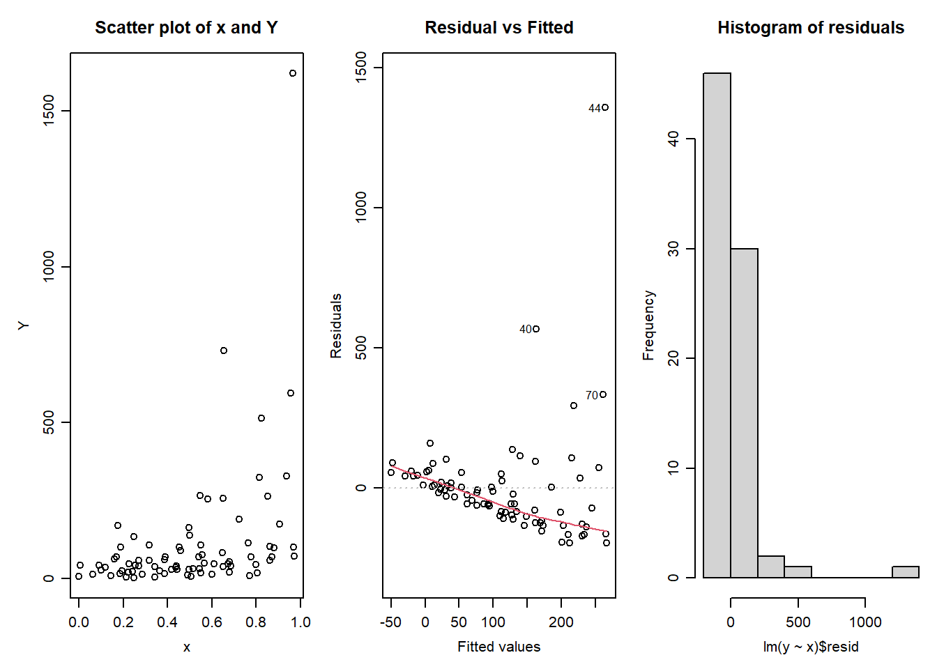 We can immediately see a number of problems that would deter us from fitting a linear regression of \(Y\) on \(x\). First, there is no clear linear relationship between \(Y\) and \(x\). Secondly, the variability of the \(Y\)-values increases with \(x\). Thirdly, the residuals of a linear regression are clearly non-normal, and heavily right-skewed. Indeed a histogram of \(Y\) shows that the outcome is heavily right skewed.