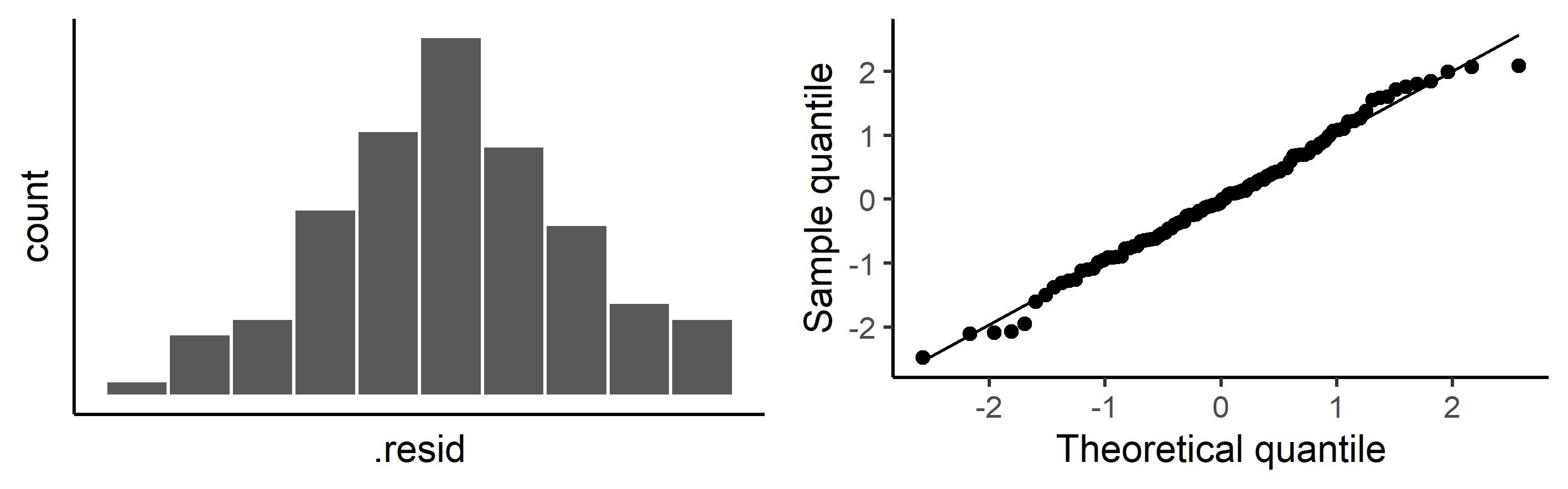 This assumption requires that the residuals be normally distributed. Note that this is an assumption about the distribution of the residuals, not about the distribution of \(Y\) or \(x\). We can plot the residuals on a histogram or normal quantile plot to assess the normality of residuals assumption – which has clearly been met in the figures below.