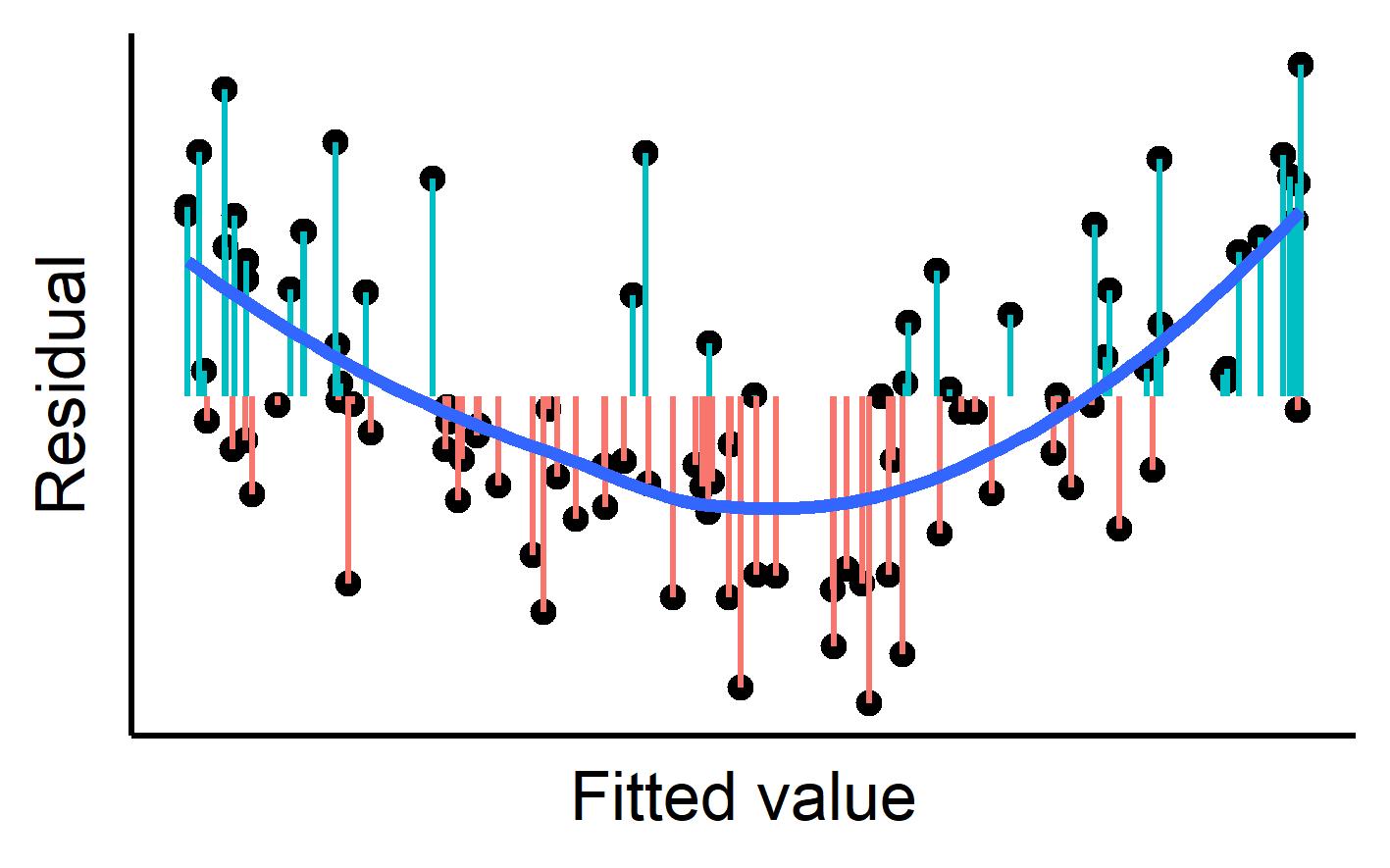 This assumption requires a linear (straight) relationship between the outcome and predictor. The plot below shows the effect of a non-linear relationship on the residuals.