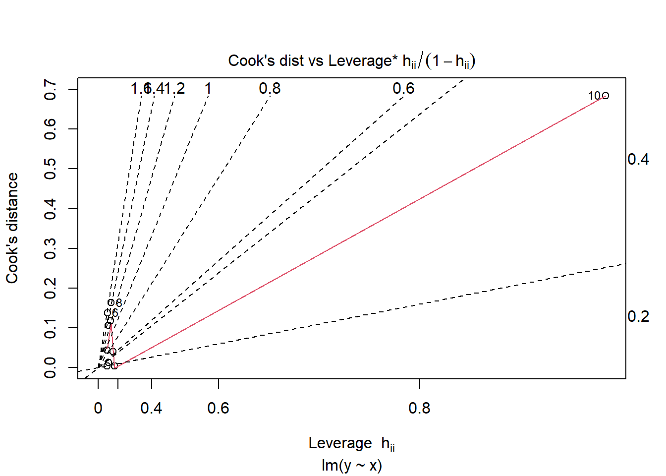 With the example using the simulated sample with 10 observations, the rule of thumb would be \(4/10\). Again, the 10th observation is above this threshold and would requires some consideration.