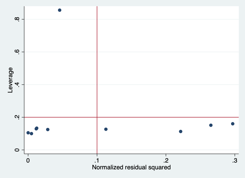 clearsetseed 1011*generate the datasetobs 10generate x = rnormal()replace x = 5 in 10generatey = rnormal(0.5+2*x,1)regressy x*leveragepredict lev, leverage*leverage computed manuallygen lev_manual =1/10 + (x- .9228745)^2/( 1.563043^2 *9)list## Number of observations (_N) was 0, now 10.## ## ## (1 real change made)## ## ## ## Source | SS df MS Number ofobs = 10## -------------+---------------------------------- F(1, 8) = 52.69## Model | 86.4227998 1 86.4227998 Prob > F = 0.0001## Residual | 13.1226538 8 1.64033173 R-squared = 0.8682## -------------+---------------------------------- Adj R-squared = 0.8517## Total | 99.5454536 9 11.060606 Root MSE = 1.2808## ## ------------------------------------------------------------------------------## y | Coefficient Std. err. t P>|t| [95% conf. interval]## -------------+----------------------------------------------------------------## x | 1.98254 .2731326 7.26 0.000 1.352695 2.612385## _cons | .516953 .477044 1.08 0.310 -.5831126 1.617018## ------------------------------------------------------------------------------## ## ## ## ## +---------------------------------------------+## | x y lev lev_ma~l |## |---------------------------------------------|## 1. | .8897727 2.534658 .1000498 .1000498 |## 2. | .0675149 1.056028 .1332746 .1332746 |## 3. | .1199856 1.148383 .1293175 .1293175 |## 4. | .1817483 1.488953 .1249804 .1249804 |## 5. | 1.257954 3.040046 .1051064 .1051064 |## |---------------------------------------------|## 6. | -.2278177 -1.908616 .160219 .1602191 |## 7. | -.1390651 -1.624345 .1512879 .1512879 |## 8. | .3885022 2.991632 .1129868 .1129868 |## 9. | 1.69015 5.084781 .1267743 .1267743 |## 10. | 5 9.654363 .8560032 .8560035 |## +---------------------------------------------+