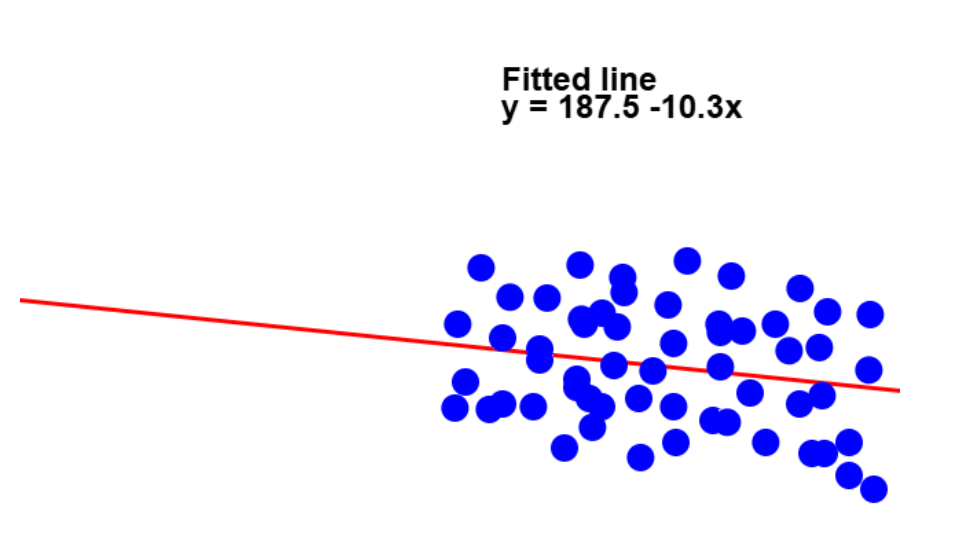 An outlier is a point with a large residual (i.e., points that are a long distance on the y-axis from the fitted line). Sometimes an outlier can have a large impact on the estimates of the regression parameter. If you move some of the points in the scatterplot below so that they become outliers (far from the other points on the y-axis / the regression line), you can see this will affect the estimated regression line. However, not all outliers are the same. Try moving up and down one of the points at the beginning or the end of the \(X\) scale. The impact in the regression line is much stronger than if you do the same with a point in the mid range of \(X\).