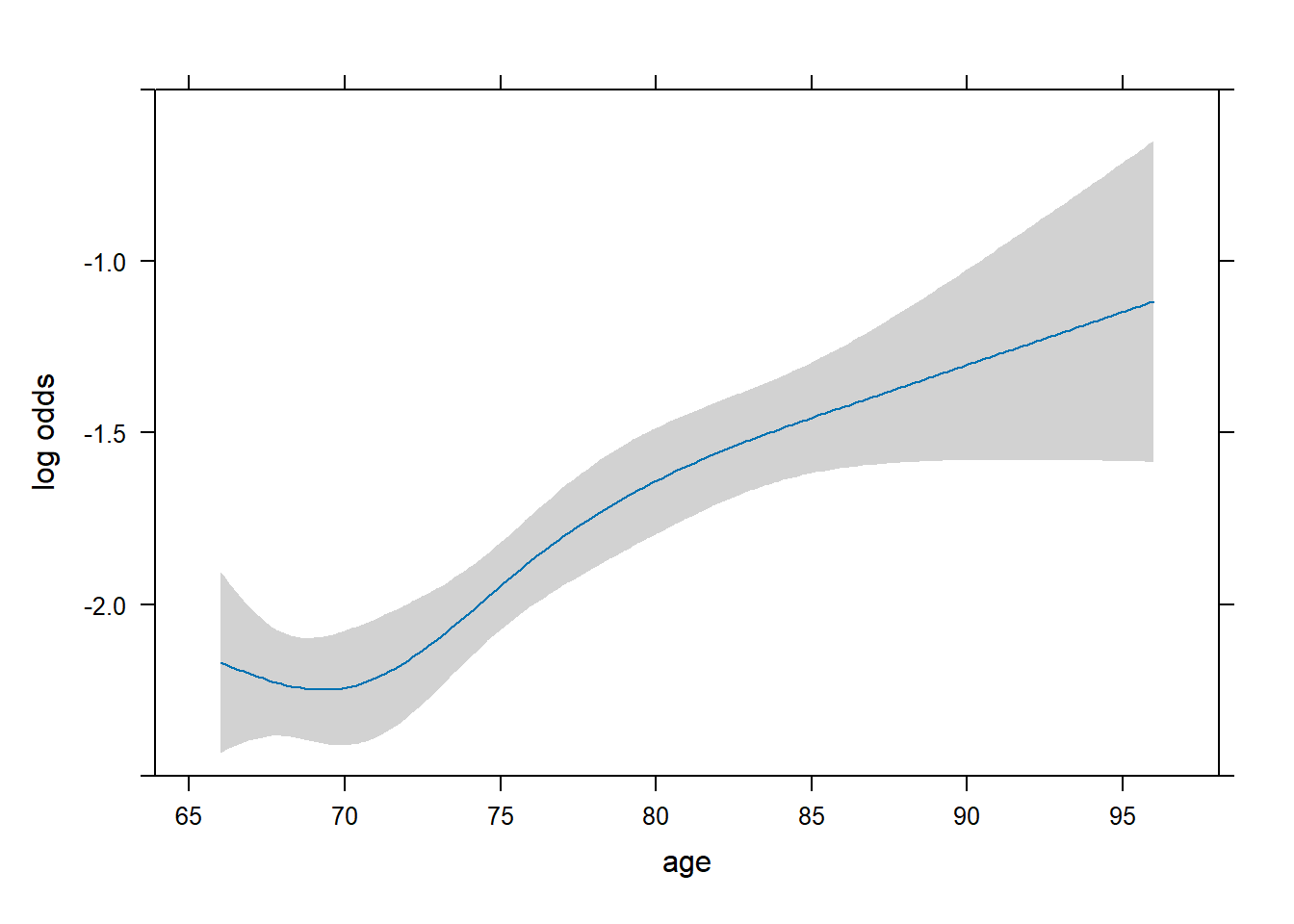 use medcare.dtareplace age=age*10** age in yearsmkspline agespl = age, cubic nknots(4) displayknotslogistic healthpoor agespl*, coeftest agespl2 agespl3 estaticlogistic healthpoor age, coefestatic** plotdrop agespl1 agespl2 agespl3mkspline2 agespl = age, cubic nknots(4)logistic healthpoor agespl*, coefadjustrcspline if age <= 95, custominvlink("xb()") ytitle("log-odds")** the option is necessary to get the plot on the log-odds scale** defalut = proba in Stata. ** the figure is not displayed (Mardown compatibility with Stata)** but you will see it when running the code## (4,406 real changes made)## ## ## | knot1 knot2 knot3 knot4 ## -------------+--------------------------------------------## age | 66 70 76 86 ## ## ## Logistic regression Number ofobs = 4,406## LR chi2(3) = 44.71## Prob > chi2 = 0.0000## Log likelihood = -1644.0085 Pseudo R2 = 0.0134## ## ------------------------------------------------------------------------------## healthpoor | Coefficient Std. err. z P>|z| [95% conf. interval]## -------------+----------------------------------------------------------------## agespl1 | -.036536 .0508291 -0.72 0.472 -.1361593 .0630872## agespl2 | .4449931 .2730339 1.63 0.103 -.0901435 .9801297## agespl3 | -.833504 .5151554 -1.62 0.106 -1.84319 .1761819## _cons | .2433287 3.465927 0.07 0.944 -6.549763 7.03642## ------------------------------------------------------------------------------## ## ## ( 1) [healthpoor]agespl2 = 0## ( 2) [healthpoor]agespl3 = 0## ## chi2( 2) = 2.67## Prob > chi2 = 0.2636## ## ## Akaike's information criterion and Bayesian information criterion## ## -----------------------------------------------------------------------------## Model | N ll(null) ll(model) df AIC BIC## -------------+---------------------------------------------------------------## . | 4,406 -1666.363 -1644.009 4 3296.017 3321.58## -----------------------------------------------------------------------------## Note: BIC uses N = number of observations. See [R] IC note.## ## ## Logistic regression Number ofobs = 4,406## LR chi2(1) = 42.05## Prob > chi2 = 0.0000## Log likelihood = -1645.3389 Pseudo R2 = 0.0126## ## ------------------------------------------------------------------------------## healthpoor | Coefficient Std. err. z P>|z| [95% conf. interval]## -------------+----------------------------------------------------------------## age | .0441932 .0066896 6.61 0.000 .0310818 .0573046## _cons | -5.240621 .5064129 -10.35 0.000 -6.233172 -4.24807## ------------------------------------------------------------------------------## ## ## Akaike's information criterion and Bayesian information criterion## ## -----------------------------------------------------------------------------## Model | N ll(null) ll(model) df AIC BIC## -------------+---------------------------------------------------------------## . | 4,406 -1666.363 -1645.339 2 3294.678 3307.459## -----------------------------------------------------------------------------## Note: BIC uses N = number of observations. See [R] IC note.## ## ## ## ## Logistic regression Number ofobs = 4,406## LR chi2(3) = 44.71## Prob > chi2 = 0.0000## Log likelihood = -1644.0085 Pseudo R2 = 0.0134## ## ------------------------------------------------------------------------------## healthpoor | Coefficient Std. err. z P>|z| [95% conf. interval]## -------------+----------------------------------------------------------------## agespl1 | -.036536 .0508291 -0.72 0.472 -.1361593 .0630872## agespl2 | .4449931 .2730339 1.63 0.103 -.0901435 .9801297## agespl3 | -.833504 .5151554 -1.62 0.106 -1.84319 .1761819## _cons | .2433287 3.465927 0.07 0.944 -6.549763 7.03642## ------------------------------------------------------------------------------