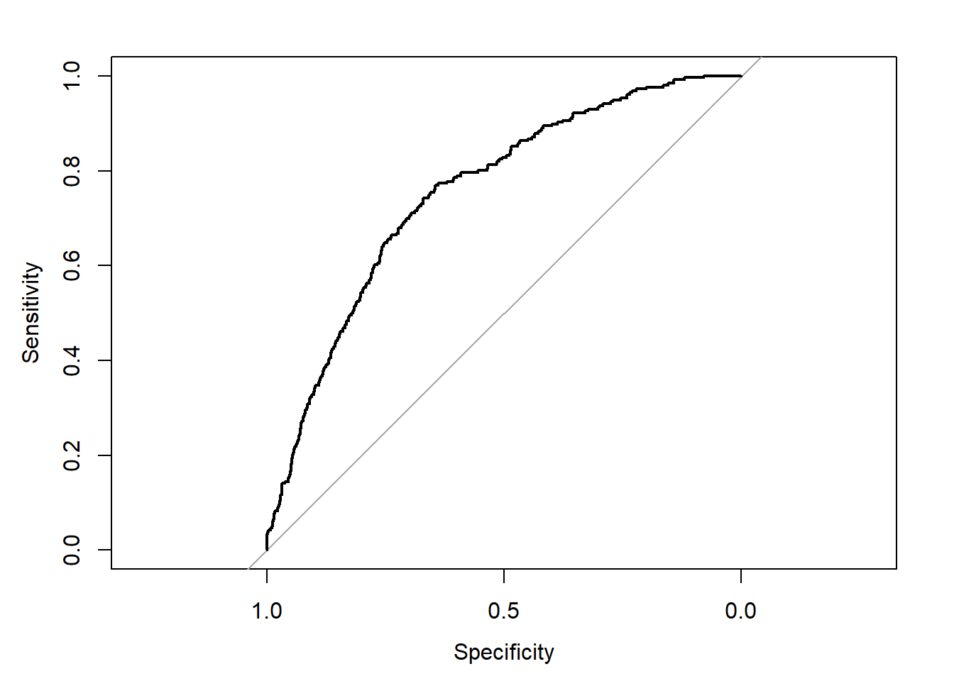 In general, the more the ROC curve is stretched towards the top left corner, the more accurate the model is. The area under the ROC curve is called the AUC (or \(C\)-statistic) and provides an overall measure of classification (prediction) accuracy, with the value of one representing perfect accuracy. The AUC returned here is 0.75, 95% CI=(0.72 ; 0.78) which could be seen as fair. In general, the following categories are considered: 0.50 - 0.59 = no discrimination, 0.60 - 0.69 = poor; 0.70 - 0.79 = fair; 0.80 - 0.89 = good; and 0.90 - 1 = excellent.