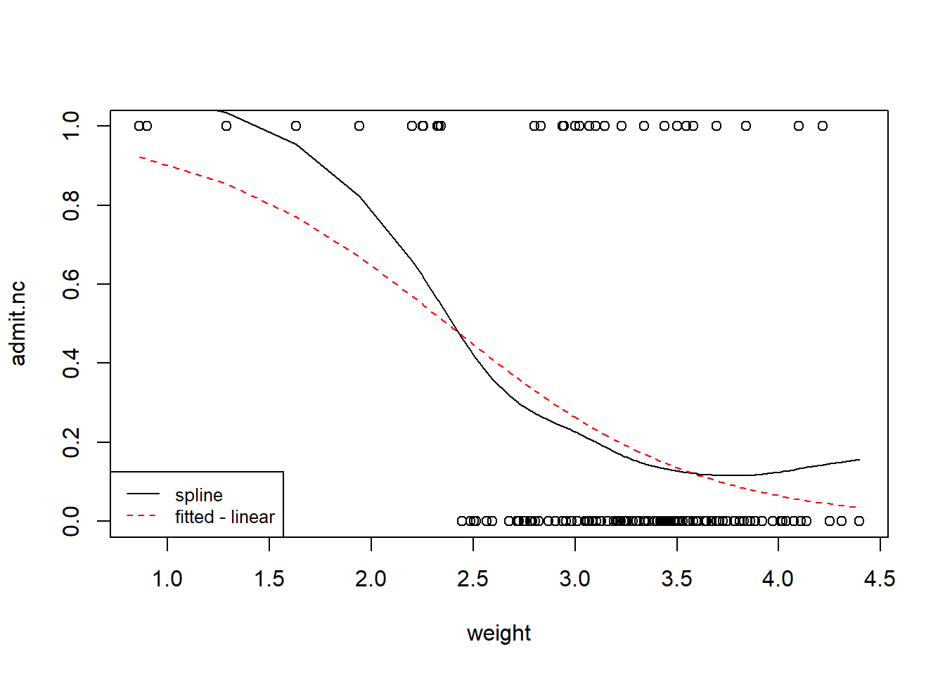 plot(admit.nc~weight,data=birth)lines(smooth.spline(birth$admit.nc~birth$weight,df=5))# NB: smooth.spline (fits a smoothing spline to the supplied data)lines(fitted(model1)[order(birth$weight)]~sort(birth$weight),lty=2,col="red")legend("bottomleft",legend=c("spline","fitted - linear"),lty=1:2, cex=0.8,col=c("black","red"))