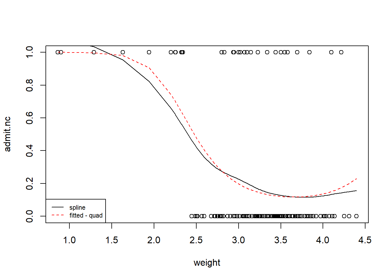 model2 <-glm(admit.nc ~ weight +I(weight^2), family=binomial,data=birth)plot(admit.nc~weight,data=birth)lines(smooth.spline(birth$admit.nc~birth$weight,df=5))# NB: smooth.spline (fits a smoothing spline to the supplied data)lines(fitted(model2)[order(birth$weight)]~sort(birth$weight),lty=2,col="red")legend("bottomleft",legend=c("spline","fitted - quad"),lty=1:2, cex=0.7,col=c("black","red"))