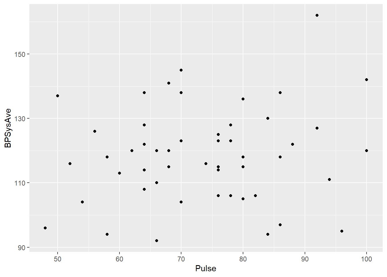 geom_point(aes(x = Pulse, y = BPSysAve)) +