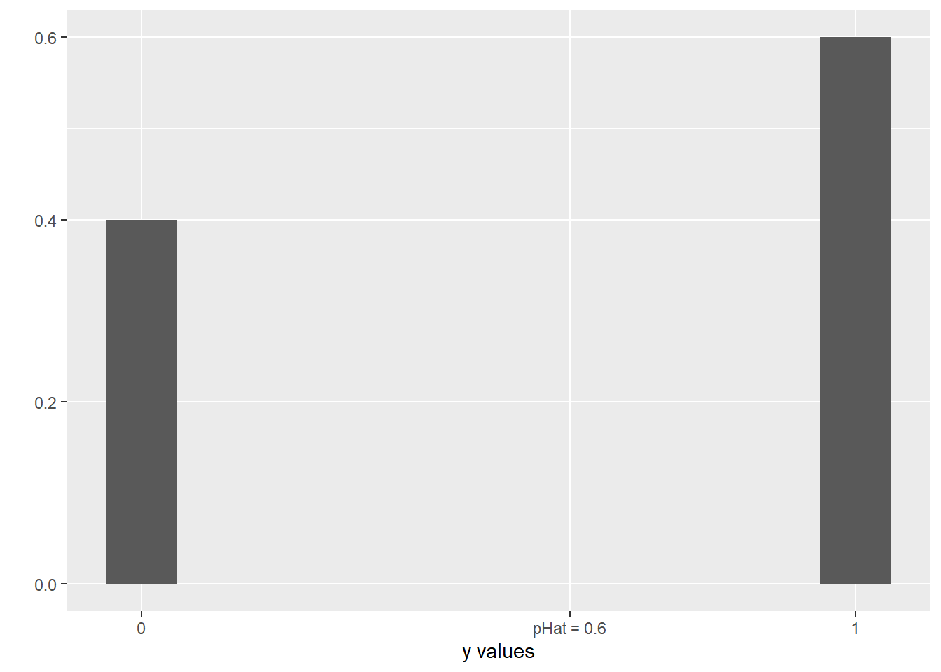 This is more like a bar graph, really. All the \(y\) values are either 0 or 1, but how many of them are 0 or 1 depends on the probability, represented by \(\widehat{p}\). In this picture, \(\widehat{p}\) is 0.6, so more of the responses are 1 than 0.