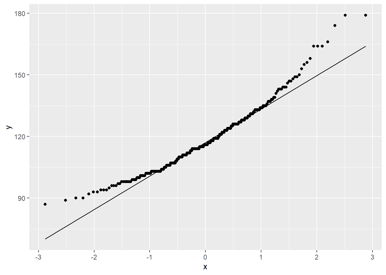 ggplot(aes(sample = BPSysAve)) + # specifying aes() here means *all* the later commands will use it