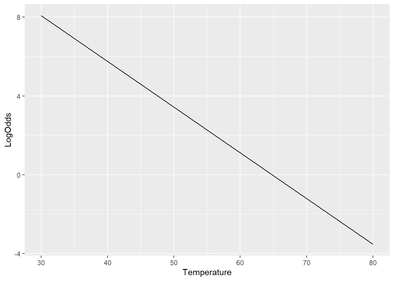There’s some stuff happening here, which we can explore more another time, but a lot of this is quite similar to what we’re used to seeing in lm summary output. Note the estimated coefficient for Temperature: -0.23. Be careful – we can’t interpret this as the slope between failure probability and temperature. Instead, we have to say that according to this model, a day with 1 degree higher temperature has log odds of failure that are 0.23 units lower. You’d have to apply the logistic function to convert this back into a statement about the probability of failure.