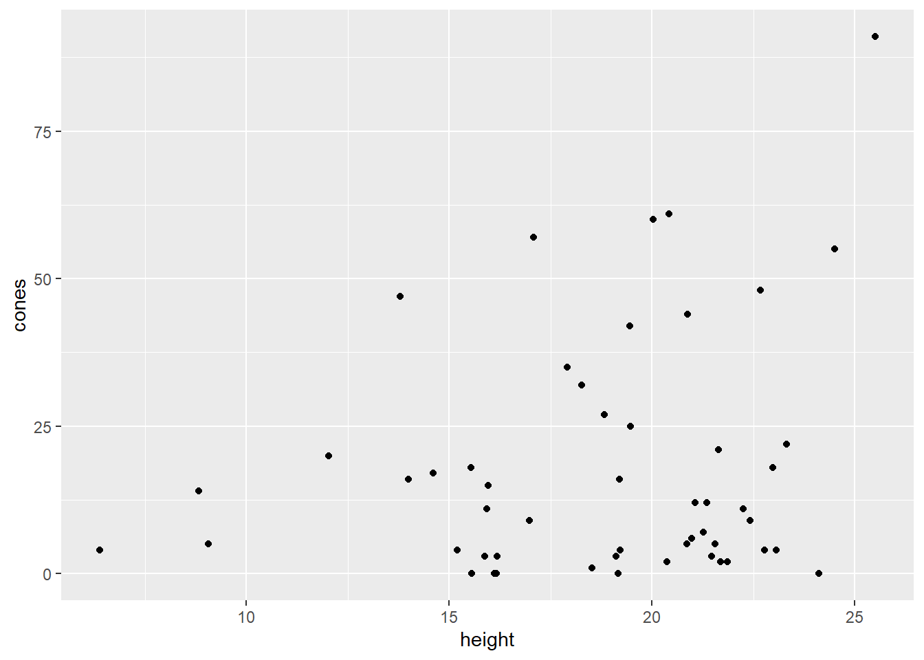 Let’s look at a plot with cones, our response, on the \(y\) axis, using the average height of the trees on the \(x\) axis: