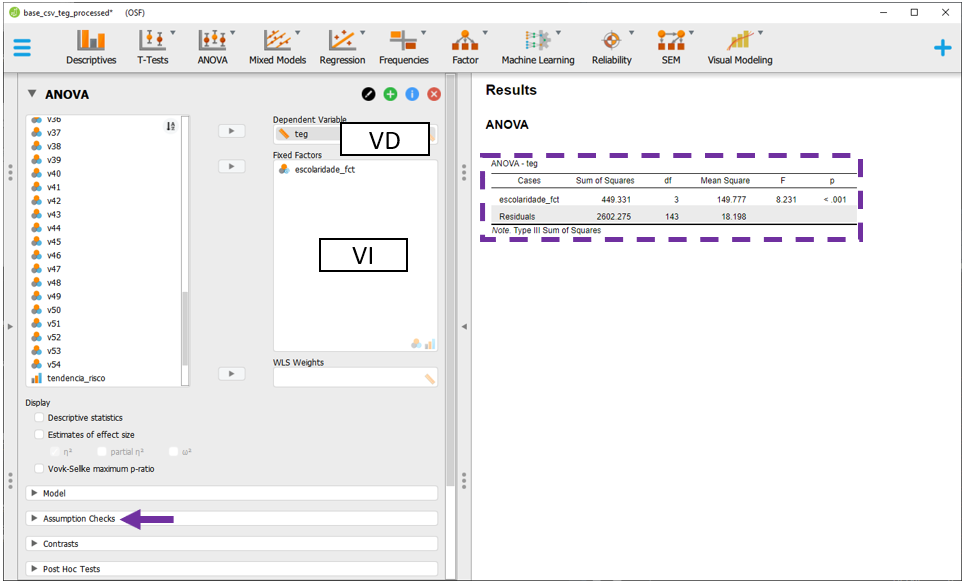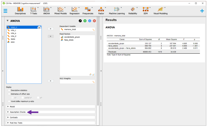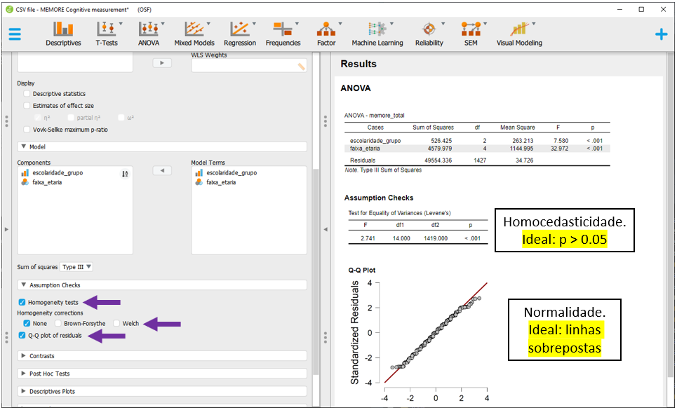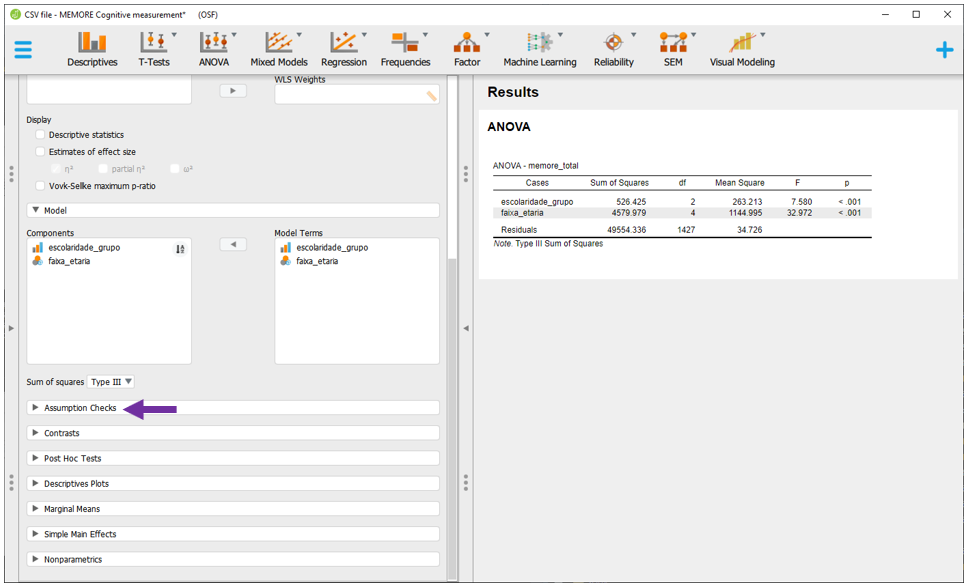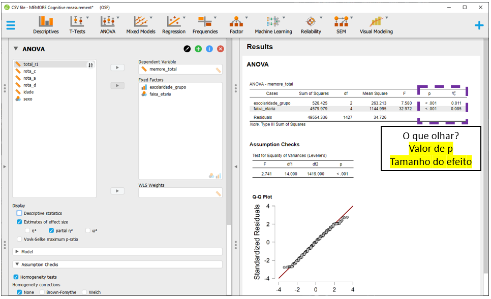 Esta tabela inicial não apresenta o tamanho do efeito e também não indica se o modelo respeitou ou violou os pressupostos. Para verificar se os pressupostos de normalidade e homocedasticidade foram respeitados, é necessário clicar em Assumption checks.