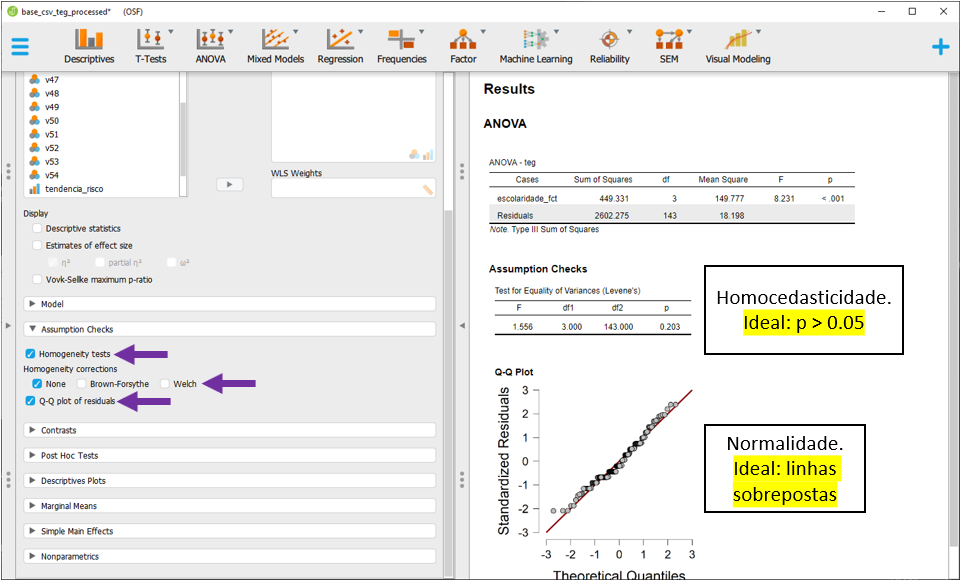 As opções Homogeneity tests e Q-Q plot of residuals deverão ser marcadas. Repare que pela impressão visual, a normalidade não foi mantida. Além disso, a homocedasticidade foi também violada. É importante ter uma atenção que os resultados do JASP foram divergentes dos resultados do R. Isso se dá pelo teste de homocedasticidade utilizado. No R, o teste foi o breusch Pagan, enquanto no JASP foi o de Levene.