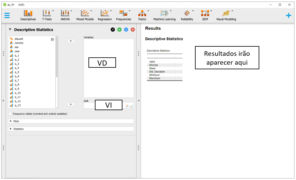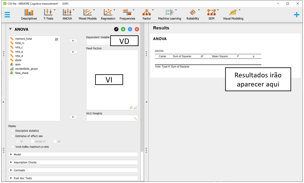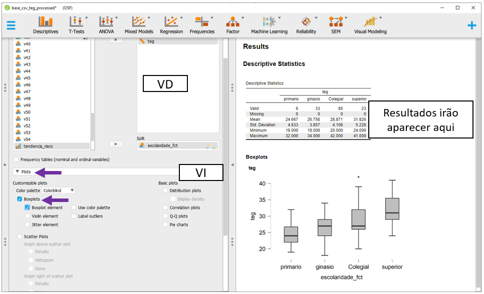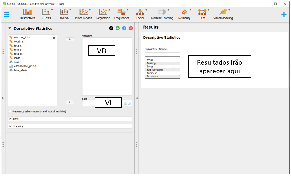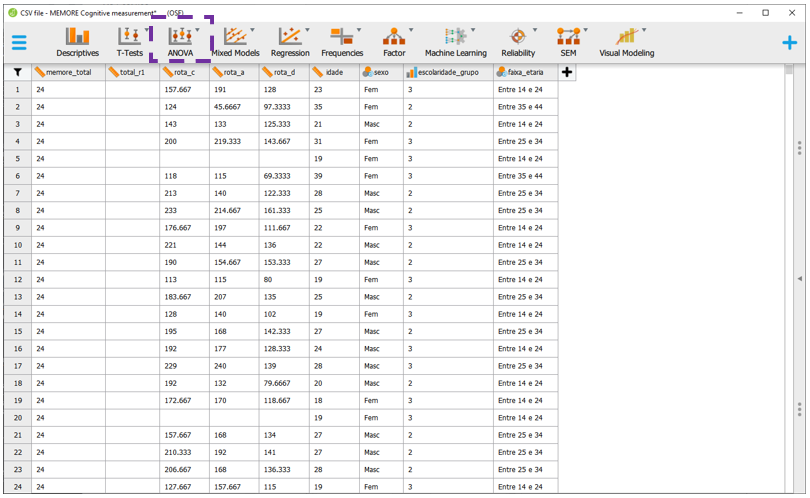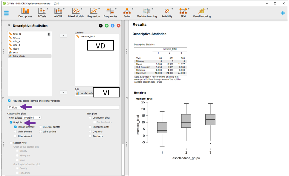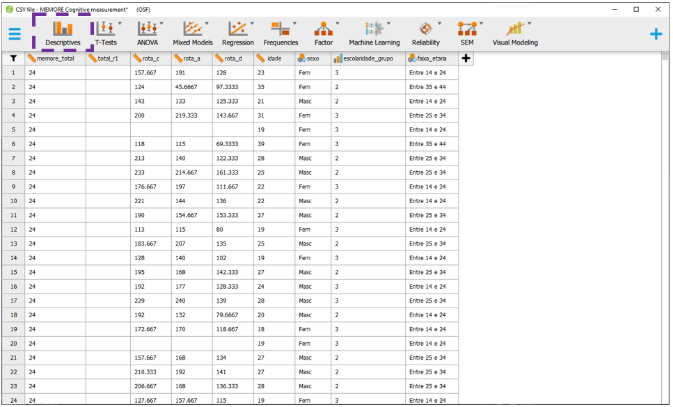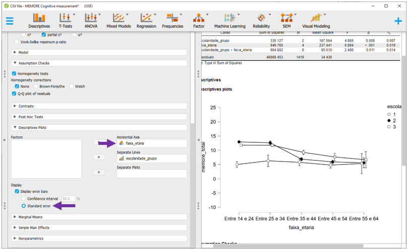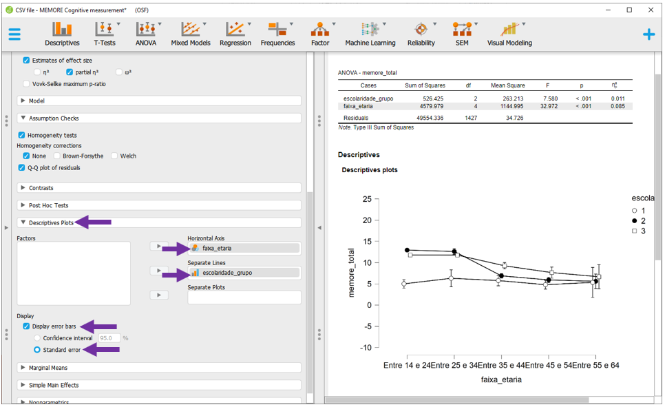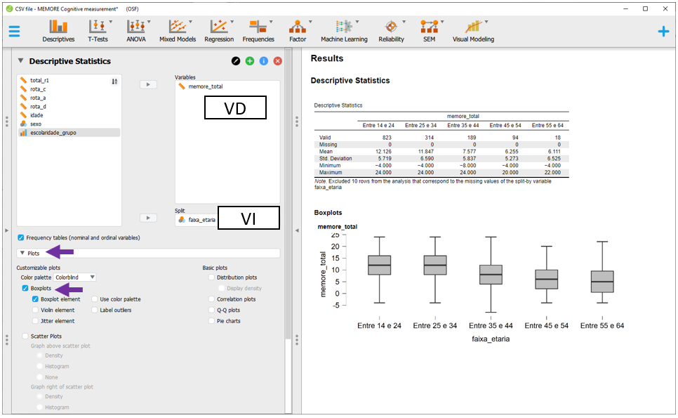 Para executar a ANOVA Fatorial no JASP, será necessário baixar a base intitulada CSV file - MEMORE Cognitive measurement.csv. Após carregar os dados no programa, a seção Descriptives apresentará o gráfico inicial dos resultados.