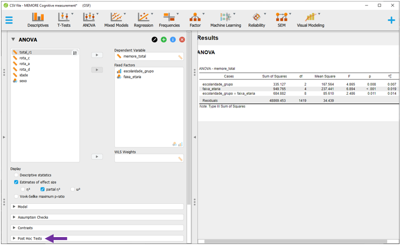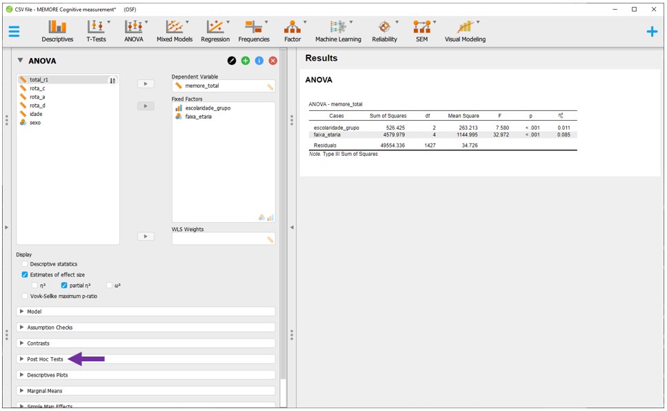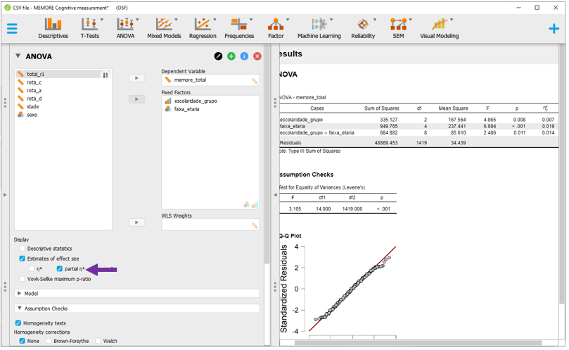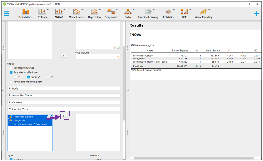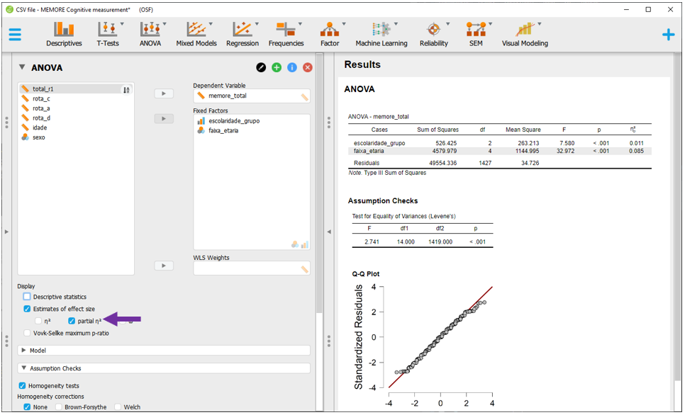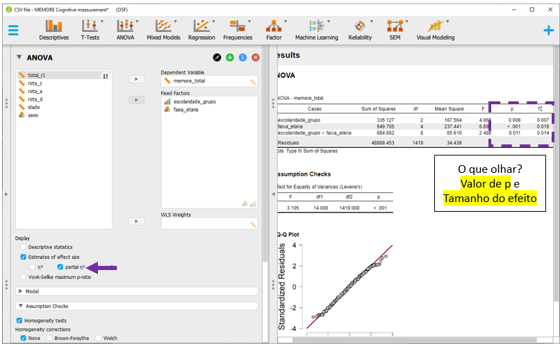 Antes de voltar à interpretação da ANOVA, é necessário inserir o tamanho do efeito. Para isso, basta clicar em Estimatives of effect size e, em seguida, no eta quadrado parcial (\(η_p^2\)). Diferente de uma ANOVA de 1 via, os resultados do \(η_p^2\) serão diferentes do (\(η^2\)). Uma vez que a ANOVA Fatorial apresenta dois preditores, o \(η_p^2\) informa a variância explicada por cada uma das variáveis após excluir a variância explicada pelas outras.