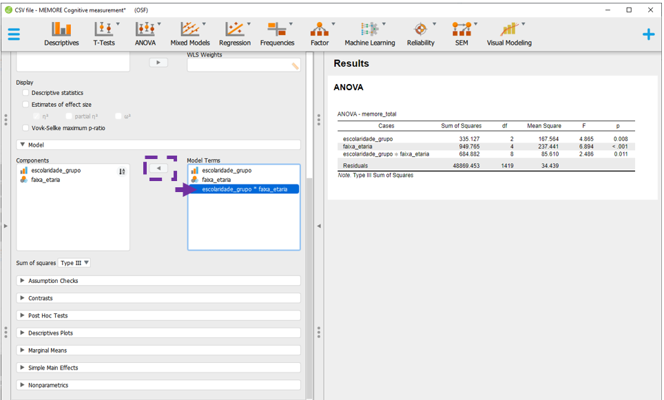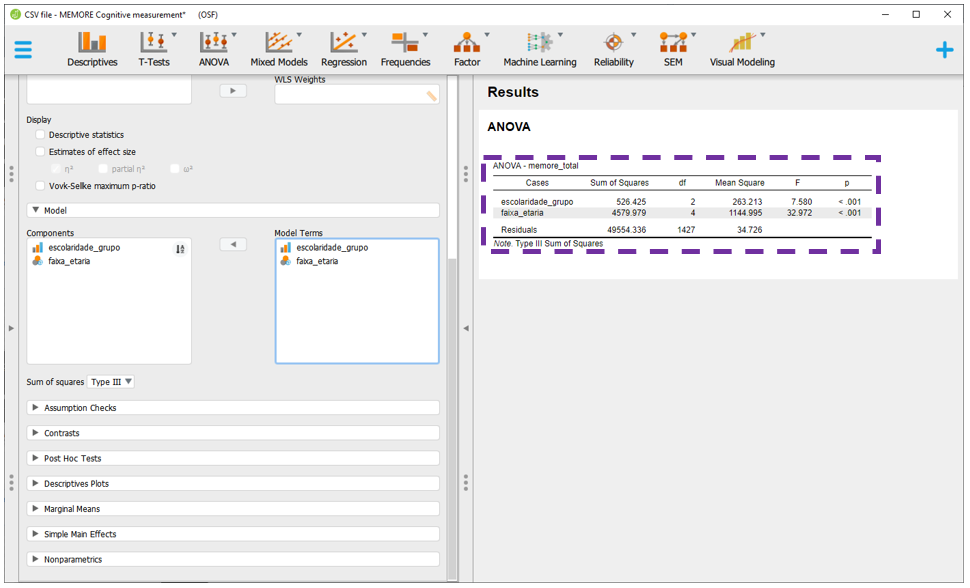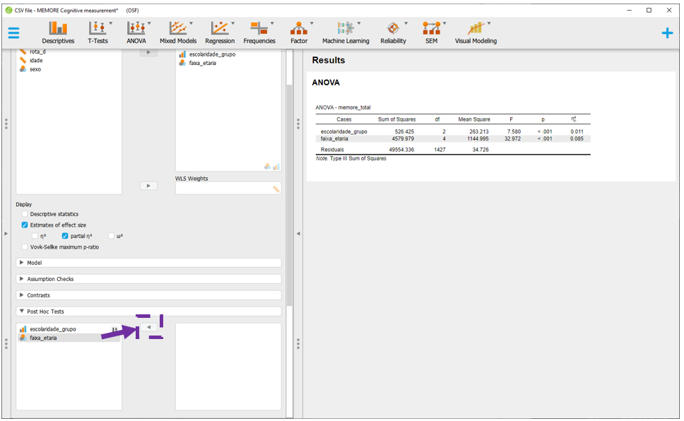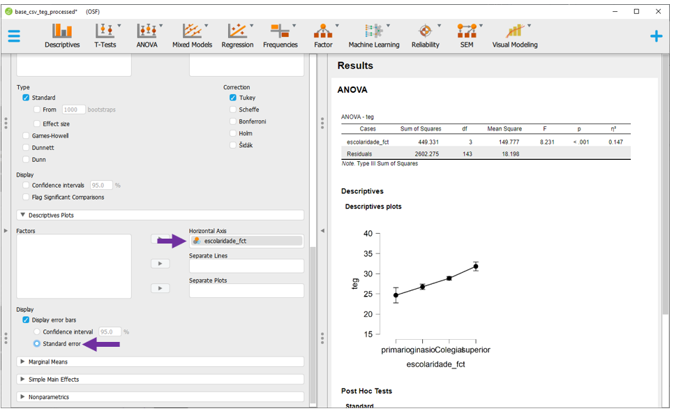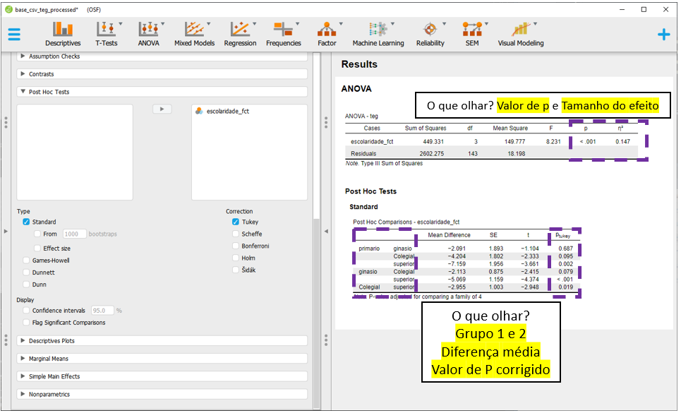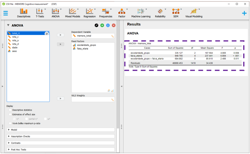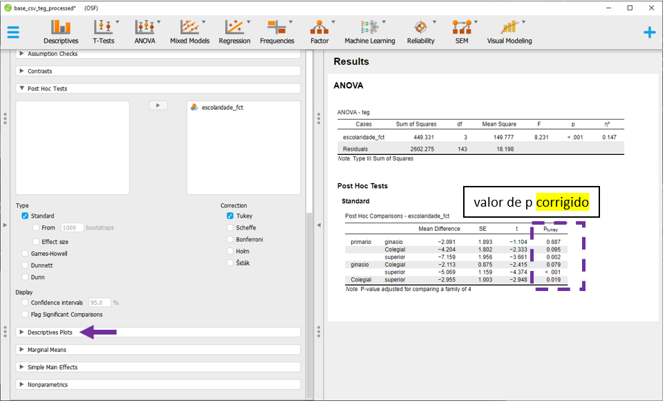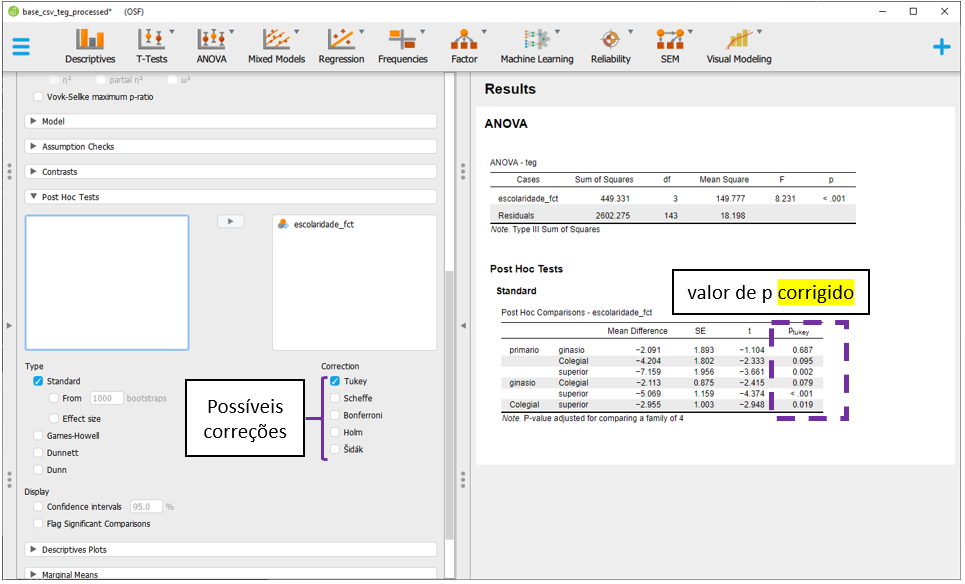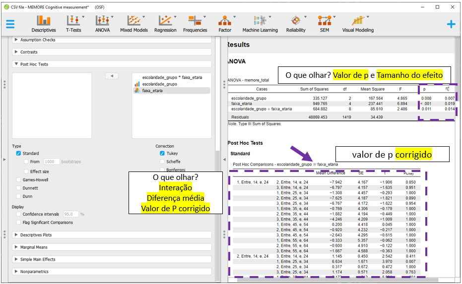 O JASP apresentará todas as comparações feitas em escolaridade, faixa_etaria e escolaridade x faixa etária, ajustando os resultados por todas as variáveis no modelo e corrigindo o valor de P. Por padrão, a correção de P é feita pelo método de Tukey, que pode ser alterada na seção Correction.