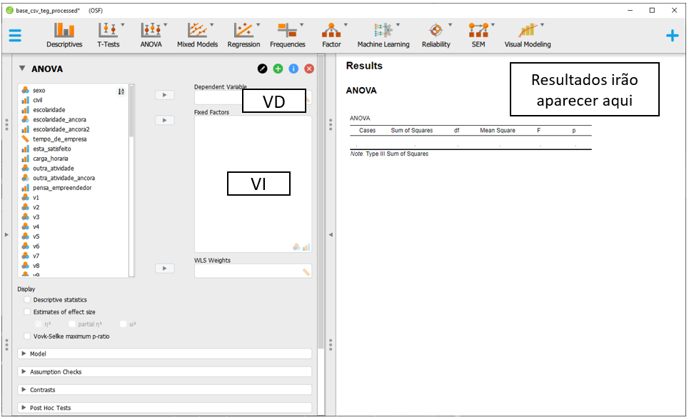 Essa etapa é similar a que foi feita na ANOVA de 1 via. Ao realizar isso, a tela a ser exibida será próxima à imagem a seguir.