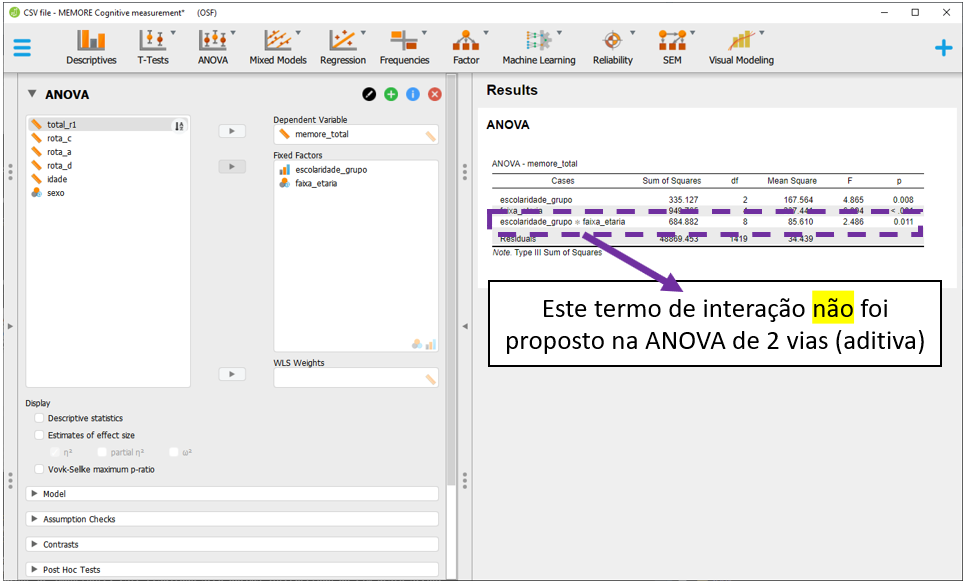 A interpretação principal é para interação escolaridade x faixa etária. No entanto, diferente do R, nesta versão do JASP não é possível reproduzir a análise feita em que a comparação entre todos os níveis de um fator é realizada enquanto se mantém o outro constante. Essa condição pode impactar um pouco na interpretação dos resultados, uma vez que os valores de P serão mais altos do que os previamente encontrados.