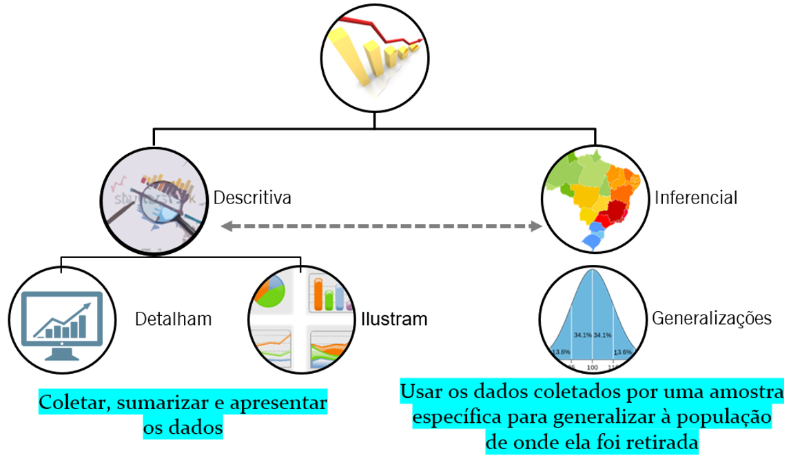 A estatística pode ser dividida em duas áreas interligadas: estatística descritiva e estatística inferencial. O objetivo da estatística descritiva é apresentar sínteses e resumos dos resultados de uma pesquisa pela utilização de gráficos e tabelas. Não é proposta dessa área fazer generalizações ou extrapolar os resultados obtidos a objetos ou pessoas não investigadas durante a coleta de dados. Por contraste, a estatística inferencial visa extrapolar os dados e fazer generalizações que toquem toda população de onde aquela mostra foi retirada e é representativa. Dessa maneira, o principal objetivo da estatística inferencial é, de fato, fazer inferências.