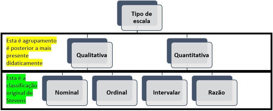 Mesmo que hoje em dia esse agrupamento seja bastante corriqueiro, origem desta iniciativa é algo incerta. Há sugestão que ela tenha começado pelo trabalho de investigação semiótica de Charles Sanders Peirce. Esse filósofo julgava que a ciência avançava em dez níveis distintos e progressivos, começando por um ícone possível (fancy), passando por um pensamento, um objeto, um símbolo numérico, uma quantidade e uma relação (Smart, 1999, p. 289). Infelizmente, essa classificação pode gerar uma divisão desnecessária dentro do próprio conceito desenvolvido por Stevens, além de gerar bastante confusão, já que o termo “pesquisa qualitativa” não costuma se referir às escalas de medida, mas sim à uma área que mais recentemente emergiu com uma forma metodológica distinta e, eventualmente, até mesmo crítica às iniciativas de medida e mensuração. Além disso, o termo “quantitativa” atribuído apenas à escala intervalar e de razão pode dar a impressão inadequada de que não se usa números nas escalas nominais ou ordinais. Finalmente, é importante frisar que há livros que utilizam o termo “categórica” para “qualitativa” e “propriamente numérico” para “quantitativa”, aumentando algo mais os cenários de confusão. A imagem a seguir apresenta esta tentativa.