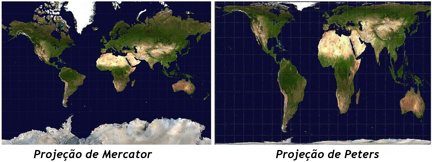 Ainda neste sentido, mapas cartográficos ilustram bem a importância dos modelos. Apesar de todos os mapas disponíveis distorcerem um pouco a área e localização dos continentes, a utilização deles é fundamental tanto na ciência como no dia-a-dia das pessoas. Na figura a seguir, o mapa à esquerda apresenta a projeção de Marcator, que é a mais utilizada nos livros. À direta, a projeção de Peters, que apesar de não ser tão utilizada, é a que melhor organiza o tamanho e o local dos continentes.