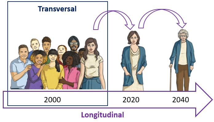 A unidade de tempo de uma pesquisa é um fator importante a ser definido antes de sua execução e a pesquisa pode ser transversal ou longitudinal. Estudos transversais são também chamados de Cross-sectional e descrevem uma situação ou fenômeno em um momento específico do tempo. Estudos longitudinais são também chamados de follow-up e contam com uma sequência temporal previamente definida. A imagem a seguir apresenta este conceito.