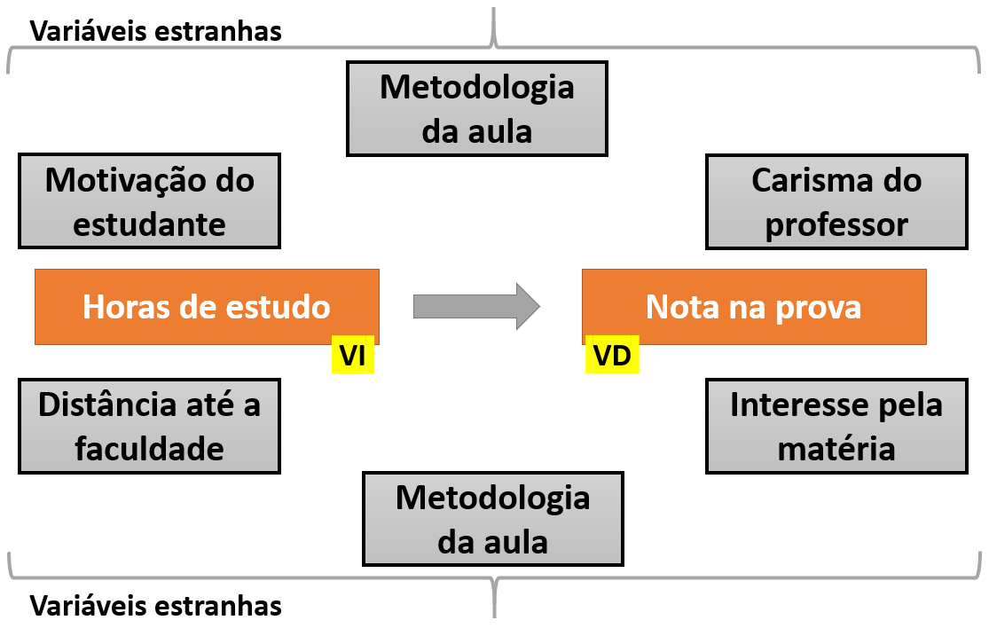 Ao se pensar nas condições em que a VI e VD estejam definidas, é fácil notar que existe um conjunto grande de outras variáveis que podem impactar neste relacionamento. Essas variáveis recebem muitos nomes e o termo variáveis estranhas (VEs) pode servir para designá-las. A imagem a seguir ilustra algumas das variáveis que poderiam impactar na relação entre horas de estudo e notas na prova, previamente assumidas como VI e VD.