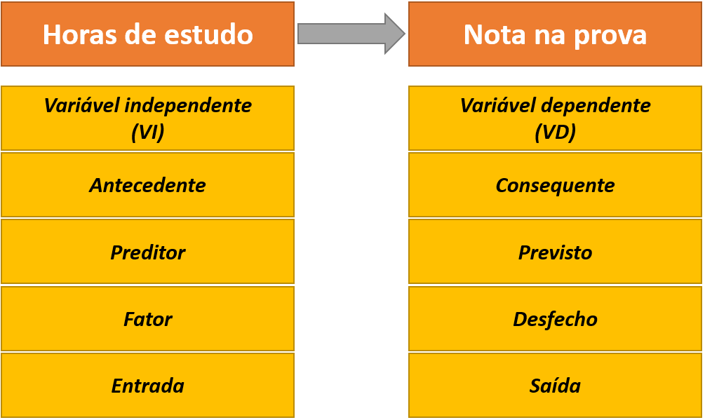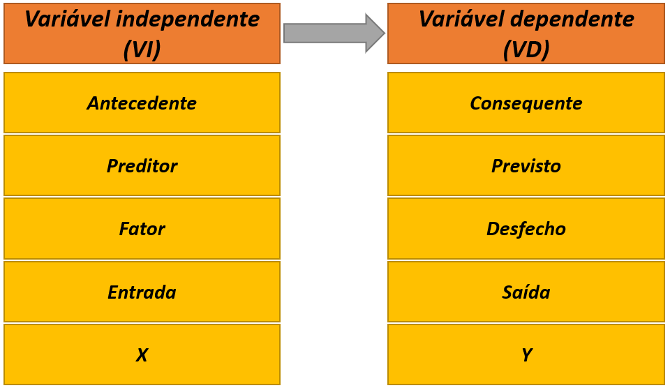 No que se refere ao relacionamento entre as variáveis, inicialmente, é possível classificá-las em independentes e dependentes. Variáveis independentes são abreviadas pela sigla VI e também são chamadas de antecedentes, preditores, fatores ou variáveis manipuladas ou de entrada. Variáveis dependentes são abreviadas por VD e também são chamadas de consequentes, previstas, desfechos ou variáveis medidas ou de saída.