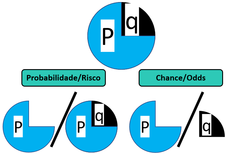 É importante distinguir o conceito de risco e chance. Risco é análogo à probabilidade, ou seja, uma razão entre uma parte contra o todo. Por sua vez, a chance é uma razão em que o numerador é uma probabilidade e o denominador é seu complemento. A figura a seguir ilustra essa diferença.