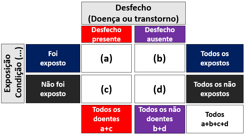 Nessa tabela, as linhas marcam condições que (quase sempre) podem ser controladas pelo pesquisador, tal como a exposição dos participantes à um fator específico ou a seleção intencional dos participantes. Por sua vez, as colunas indicam os desfechos que, com muita frequência, são formados por uma doença ou algum transtorno mental.