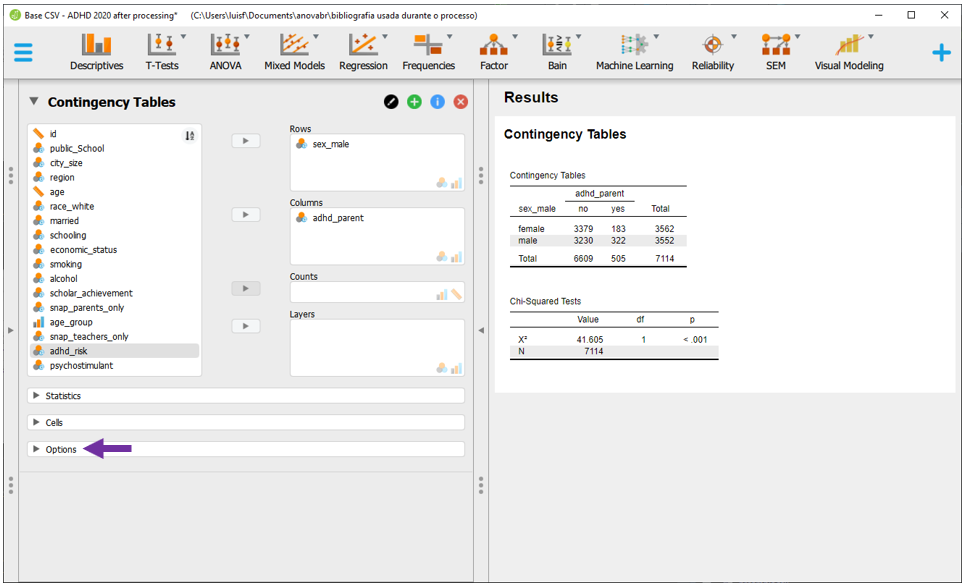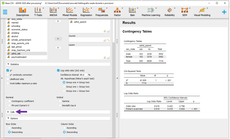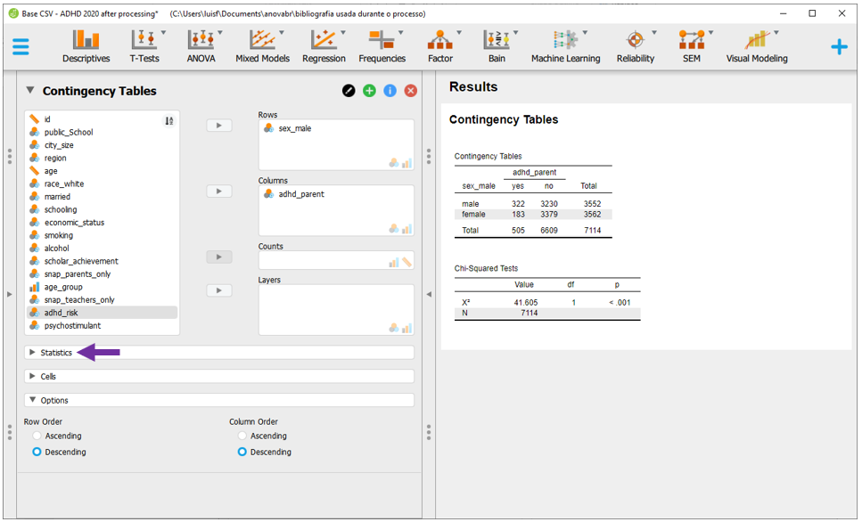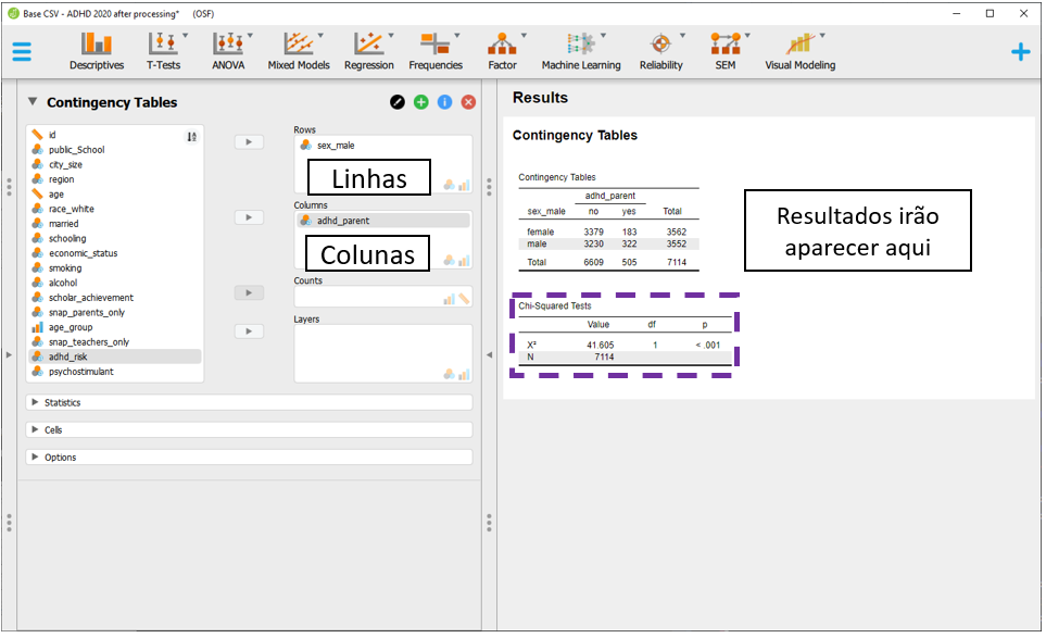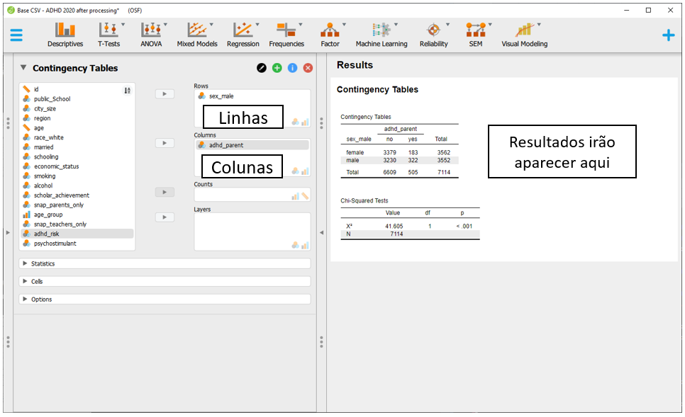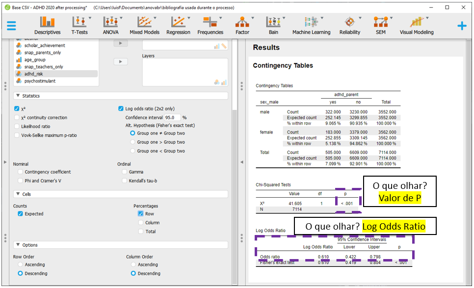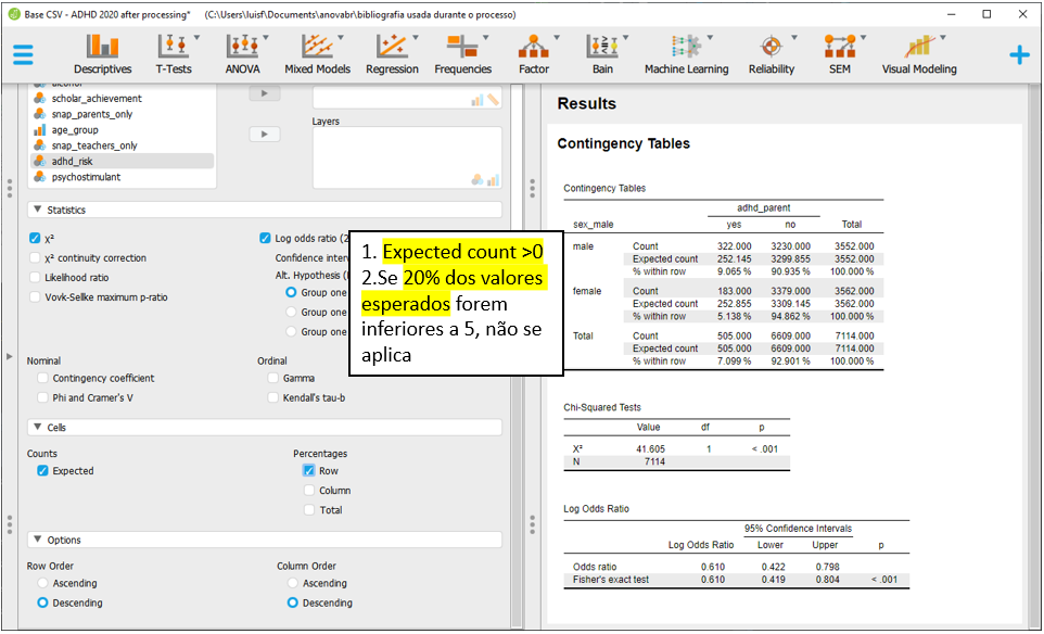 Há dois blocos específicos, Counts e Percentages. Em Counts, é necessário selecionar Expected. Em Percenatges, é necessário selecionar Row. Com isso feito, os resultados poderão ser melhor analisados.