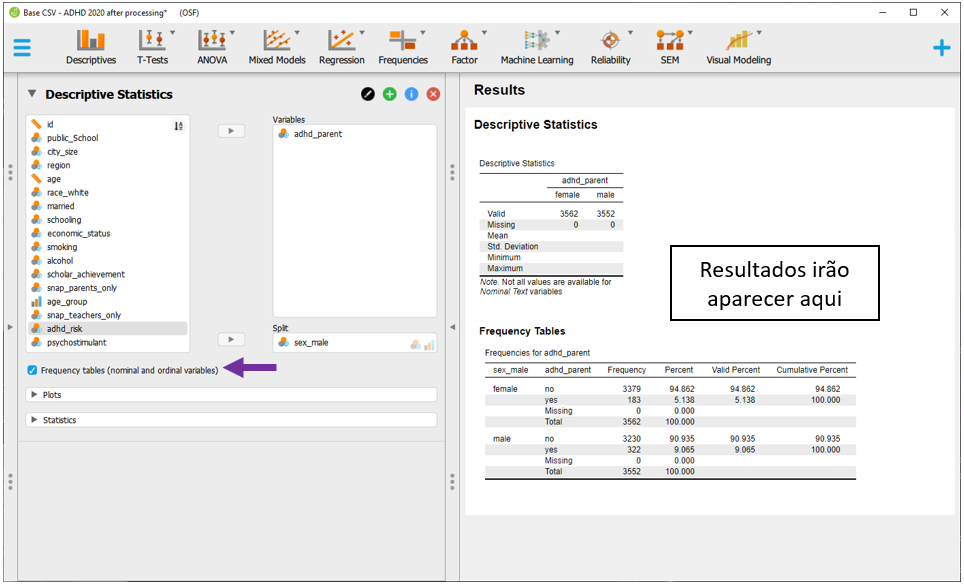 É necessário inserir a variável sex_male para Split e a variável adhd_parent para Variables. Para tabela ser apresentada corretamente, deve-se selecionar a opção Frequency tables.