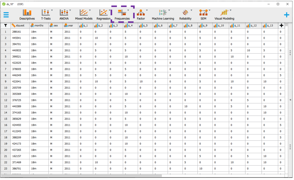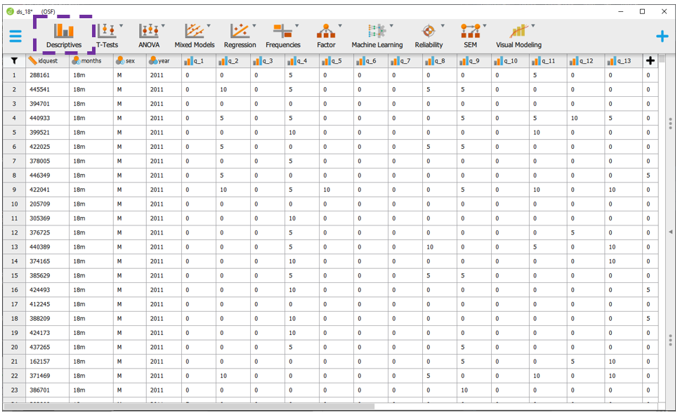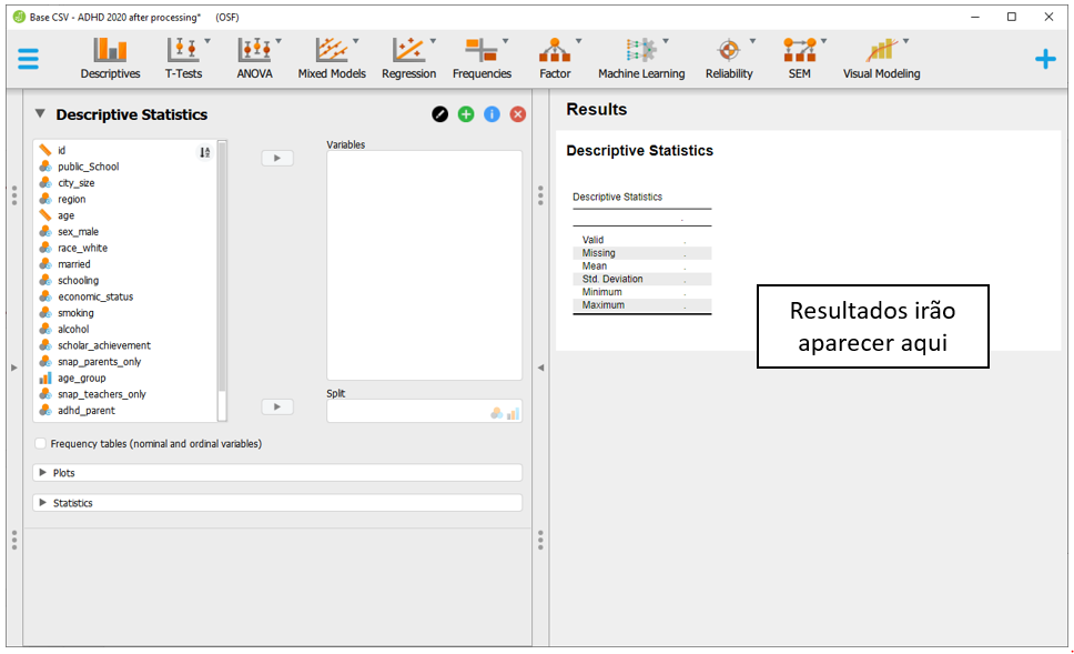 Para executar as rotinas propostas no JASP, será necessário carregar a base para o programa. Com os dados devidamente importados para o programa, a apresentação de tabelas e gráficos auxiliam o pesquisador a verificar padrões diferentes nos dados. Para executar isso, é necessário acessar a seção Descriptives: