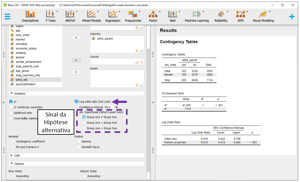 Nesta tela, será necessário clicar em Log odds. Essa opção é disponível apenas para tabelas de dupla entrada, como a que está sendo analisada neste momento. É possível definir o sinal da hipótese alternativa para que a significância estatística seja computada de acordo, o que não será feito neste momento.