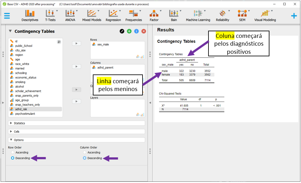 Será necessário clicar em Descending tanto em Row Order como em Column Order. Isso irá indicar que a primeira linha será formada por meninos e a primeira coluna será formada por participantes com diagnóstico positivo.